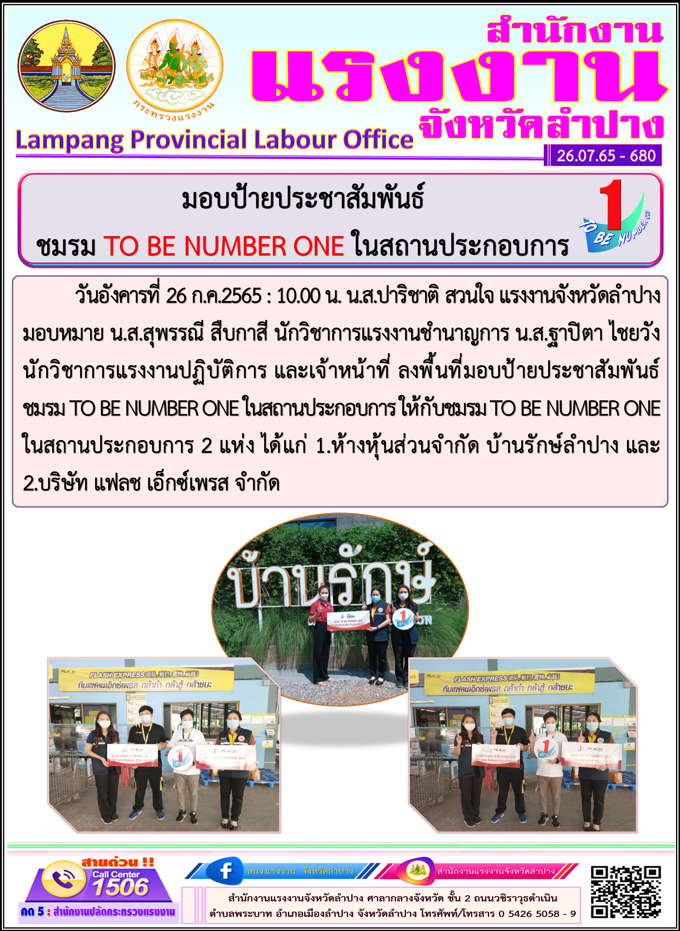 สรจ.ลำปาง มอบป้ายประชาสัมพันธ์ชมรม TO BE NUMBER ONE ในสถานประกอบการ