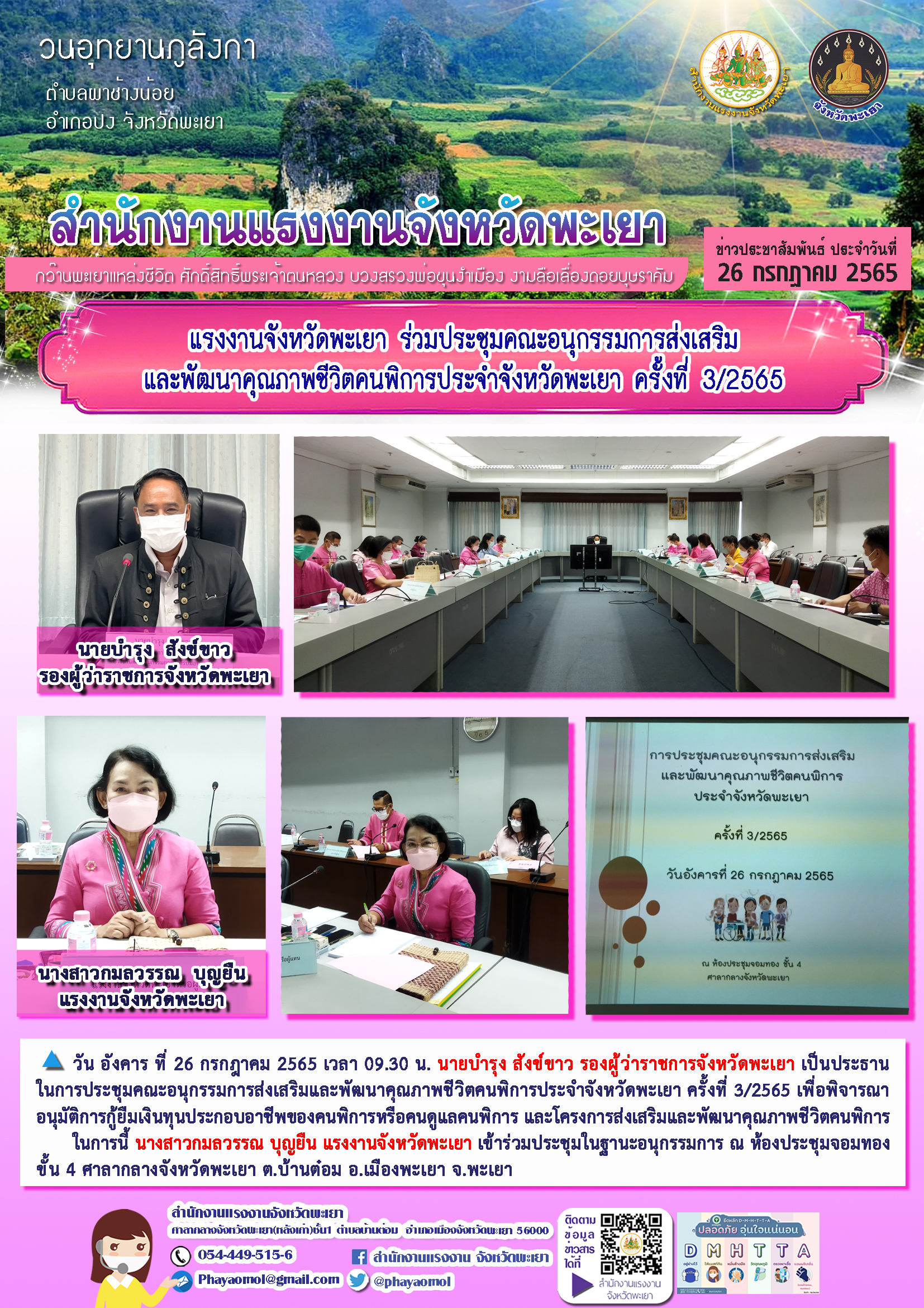 แรงงานจังหวัดพะเยา ร่วมประชุมคณะอนุกรรมการส่งเสริมและพัฒนาคุณภาพชีวิตคนพิการประจำจังหวัดพะเยา ครั้งที่ 3/2565