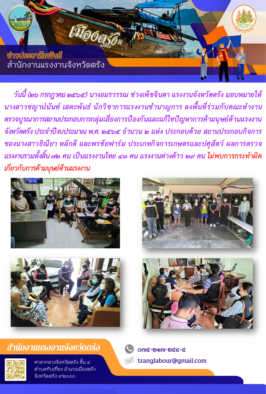 แรงงานจังหวัดตรัง มอบหมายให้ นางสาวชญาน์นันท์ เสตะพันธ์ นักวิชาการแรงงานชำนาญการ ลงพื้นที่ร่วมกับคณะทำงานตรวจบูรณาการสถานประกอบการกลุ่มเสี่ยงการป้องกันและแก้ไขปัญหาการค้ามนุษย์ด้านแรงงาน จังหวัดตรัง ประจำปีงบประมาณ พ.ศ. 2565