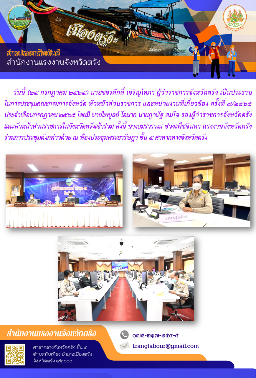 แรงงานจังหวัดตรัง ร่วมการประชุมคณะกรมการจังหวัด หัวหน้าส่วนราชการ และหน่วยงานที่เกี่ยวข้อง ครั้งที่ ๗/๒๕๖๕ ประจำเดือนกรกฎาคม ๒๕๖๕
