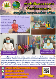 แรงงานจังหวัดหนองคาย มอบหมายให้ นางสาวลีลาวดี ศรีภูธร นักวิชาการแรงงานชำนาญงาน ร่วมโครงการสมัชชาครอบครัวจังหวัดหนองคาย ภายใต้แนวคิด “การสร้างสภาพแวดล้อมที่เป็นมิตรต่อสิ่งแวดล้อม (Family Friendly Society) ประจำปีงบประมาณ 2565”