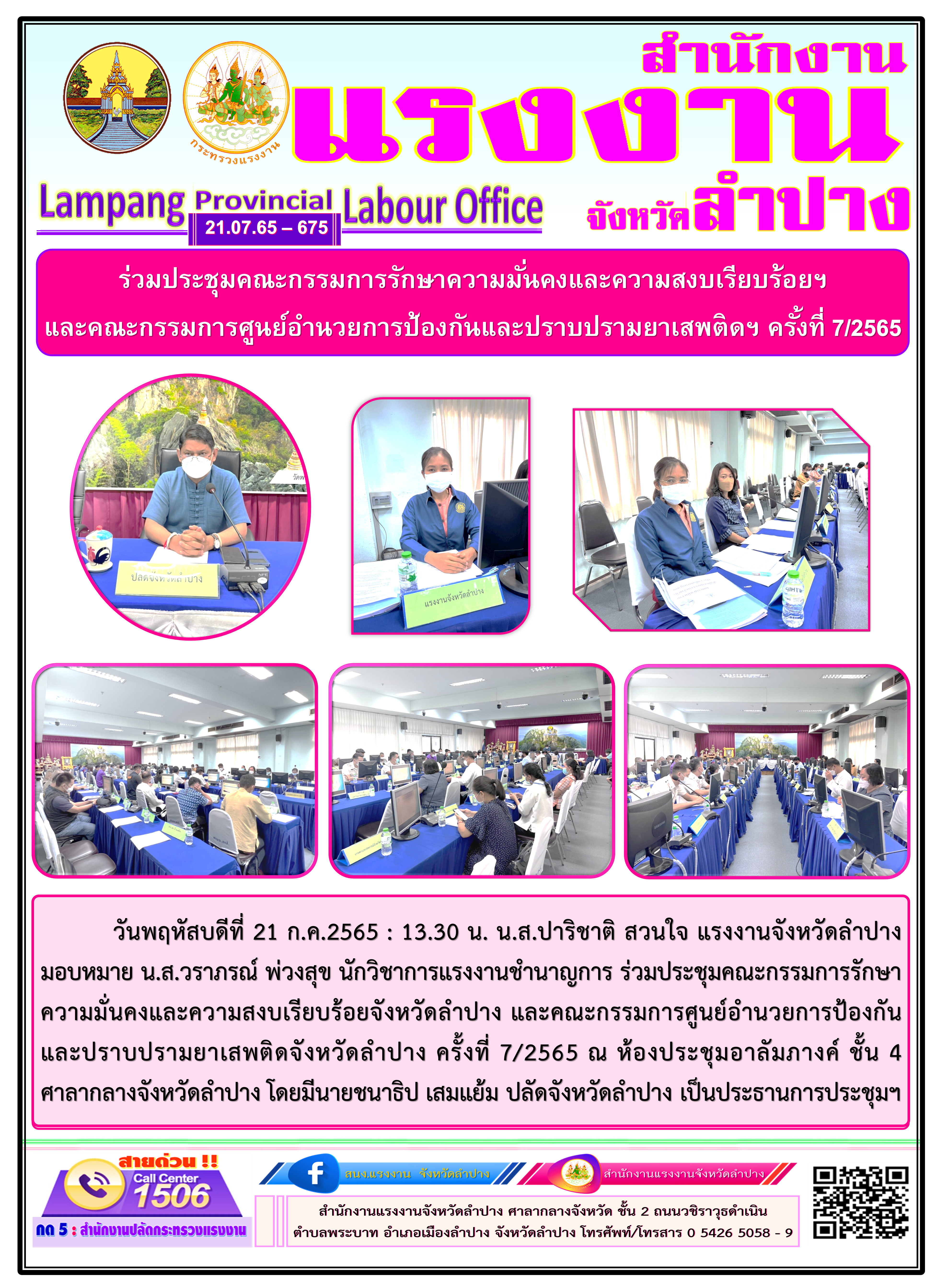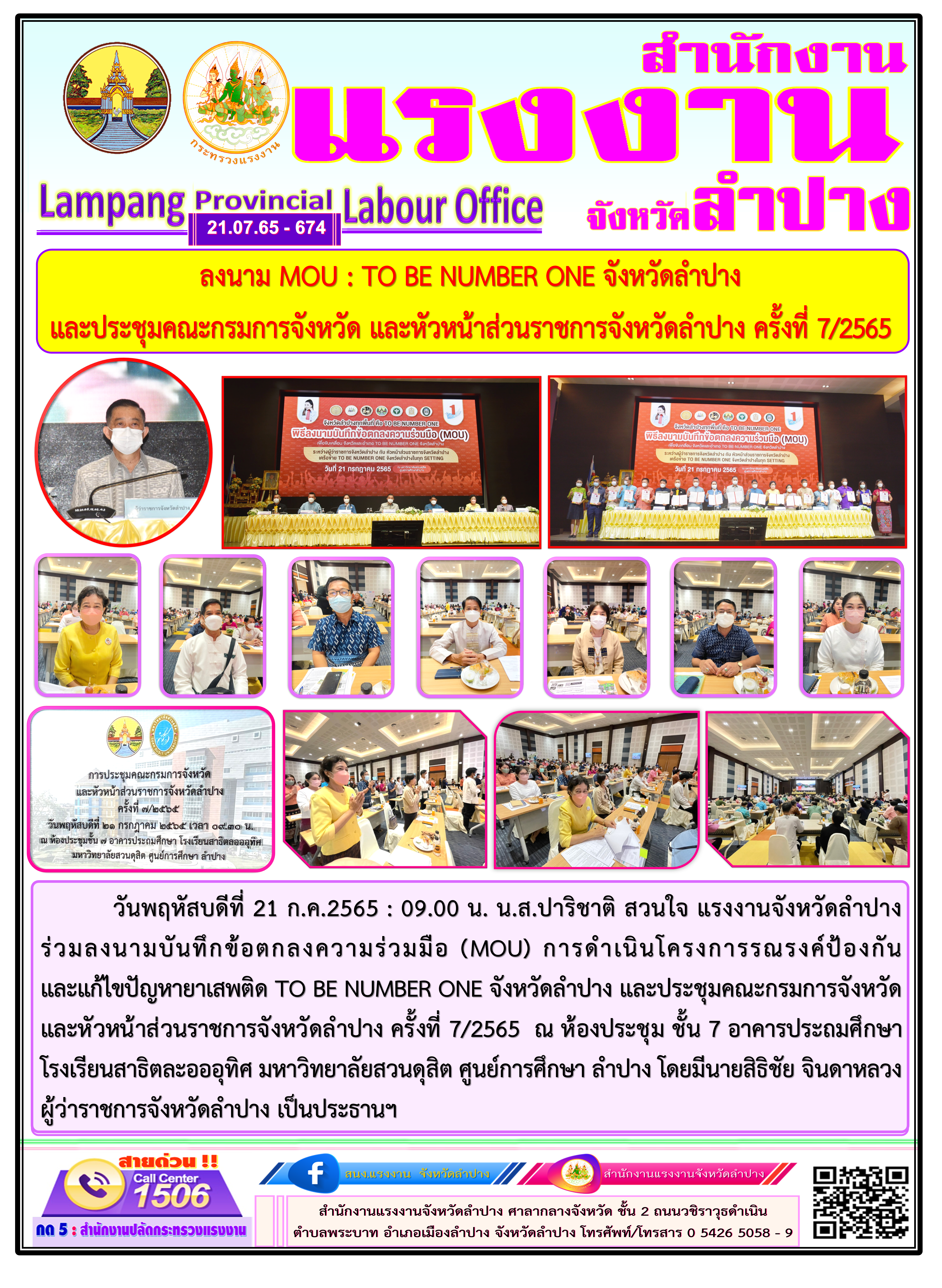 แรงงานจังหวัดลำปาง ร่วมลงนาม MOU : TO BE NUMBER ONE จังหวัดลำปาง และประชุมคณะกรมการจังหวัด และหัวหน้าส่วนราชการจังหวัดลำปาง ครั้งที่ 7/2565
