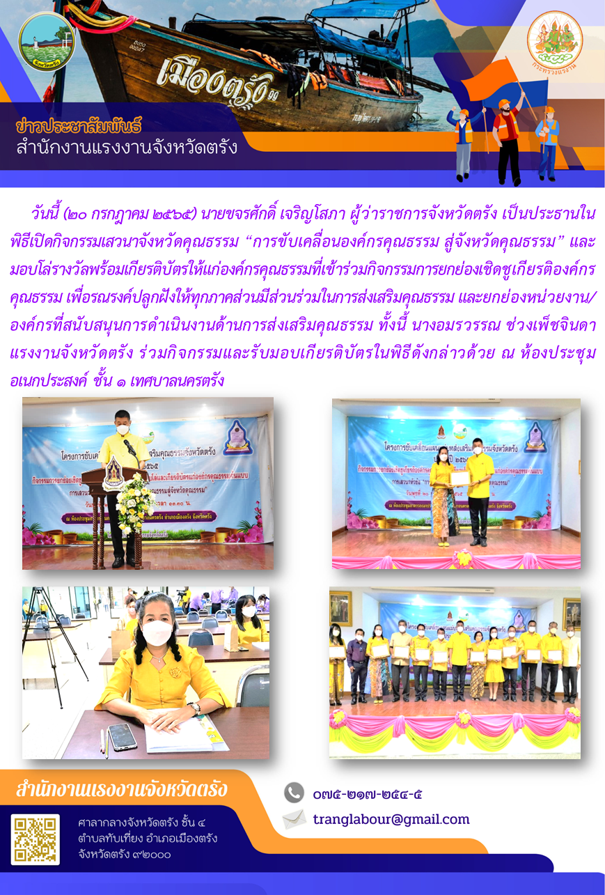 แรงงานจังหวัดตรัง ร่วมพิธีและรับมอบเกียรติบัตรในกิจกรรมเสวนาจังหวัดคุณธรรม “การขับเคลื่อนองค์กรคุณธรรม สู่จังหวัดคุณธรรม” ณ ห้องประชุมอเนกประสงค์ ชั้น 1 เทศบาลนครตรัง