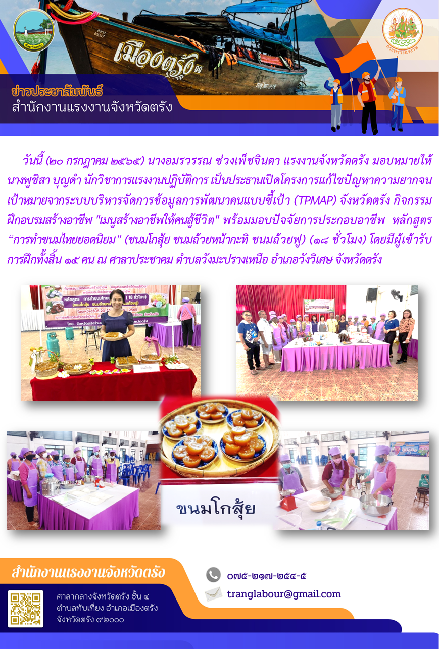แรงงานจังหวัดตรัง มอบหมายให้ นางพูชิสา บุญดำ นักวิชาการแรงงานปฏิบัติการ เป็นประธานเปิดโครงการแก้ไขปัญหาความยากจนเป้าหมายจากระบบบริหารจัดการข้อมูลการพัฒนาคนแบบชี้เป้า (TPMAP) จังหวัดตรัง กิจกรรมฝึกอบรมสร้างอาชีพ “เมนูสร้างอาชีพให้คนสู้ชีวิต” พร้อมมอบปัจจัยการประกอบอาชีพ หลักสูตร “การทำขนมไทยยอดนิยม” ณ ศาลาประชาคม ตำบลวังมะปรางเหนือ