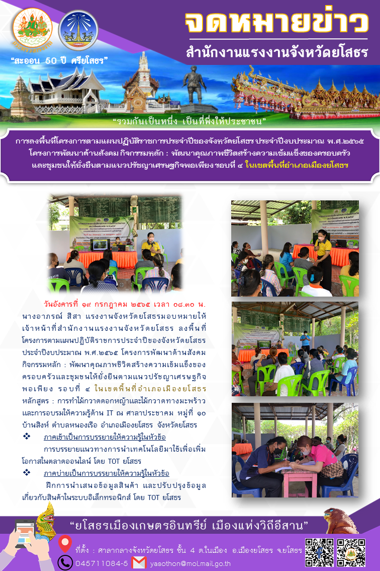 การลงพื้นที่โครงการตามแผนปฏิบัติราชการประจำปีของจังหวัดยโสธร ประจำปีงบประมาณ พ.ศ.๒๕๖๕ โครงการพัฒนาด้านสังคม กิจกรรมหลัก : พัฒนาคุณภาพชีวิตสร้างความเข้มแข็งของครอบครัวและชุมชนให้ยั่งยืนตามแนวปรัชญาเศรษฐกิจพอเพียง รอบที่ ๔ ในเขตพื้นที่อำเภอเมืองยโสธร