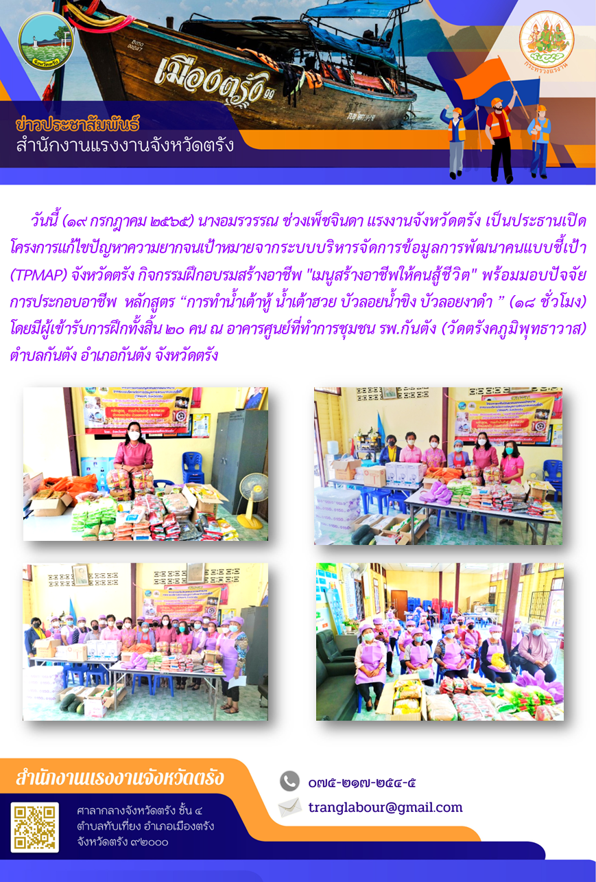 แรงงานจังหวัดตรัง เป็นประธานเปิดโครงการแก้ไขปัญหาความยากจนเป้าหมายจากระบบบริหารจัดการข้อมูลการพัฒนาคนแบบชี้เป้า (TPMAP) จังหวัดตรัง กิจกรรมฝึกอบรมสร้างอาชีพ “เมนูสร้างอาชีพให้คนสู้ชีวิต” พร้อมมอบปัจจัยการประกอบอาชีพ ณ อาคารศูนย์ที่ทำการชุมชน รพ.กันตัง (วัดตรังคภูมิพุทธาวาส)