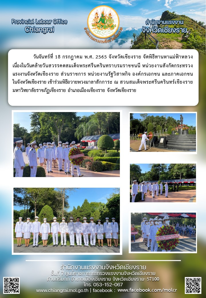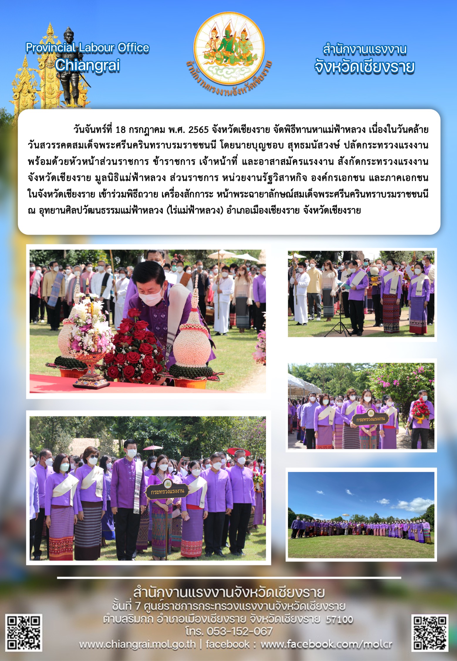 จังหวัดเชียงราย จัดพิธีทานหาแม่ฟ้าหลวงเนื่องในวันคล้ายวันสวรรคตสมเด็จพระศรีนครินทรทราบรมราชชนนี โดยนายบุญชอบ สุทธมนัสวงษ์ ปลัดกระทรวงแรงงานพร้อมด้วยหัวหน้าหน่วยราชการ ข้าราชการ เจ้าหน้าที่ และอาสาสมัครแรงงาน สังกัดกระทรวงแรงงานจังหวัดเชียงราย เข้าร่วมพิธีถวาย เครื่องสักการะ