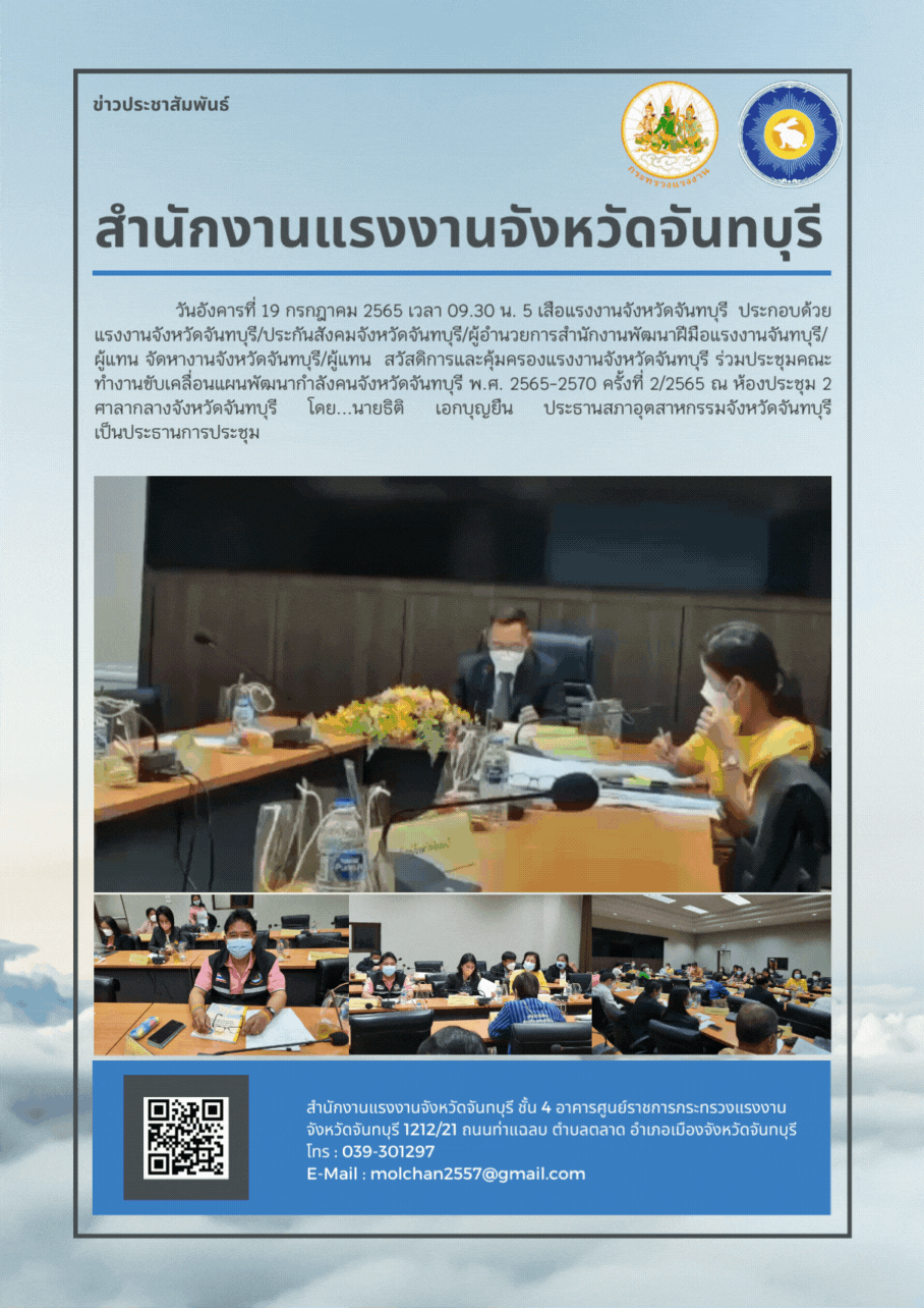 5 เสือแรงงานจังหวัดจันทบุรี ประกอบด้วย แรงงานจังหวัดจันทบุรี/ ประกันสังคมจังหวัดจันทบุรี/ผู้อำนวยการสำนักงานพัฒนาฝีมือแรงงานจันทบุรี/ผู้แทน จัดหางานจังหวัดจันทบุรี/ผู้แทน สวัสดิการและคุ้มครองแรงงานจังหวัดจันทบุรี ร่วมประชุมคณะทำงานขับเคลื่อนแผนพัฒนากำลังคนจังหวัดจันทบุรี พ.ศ. 2565-2570 ครั้งที่ 2/2565