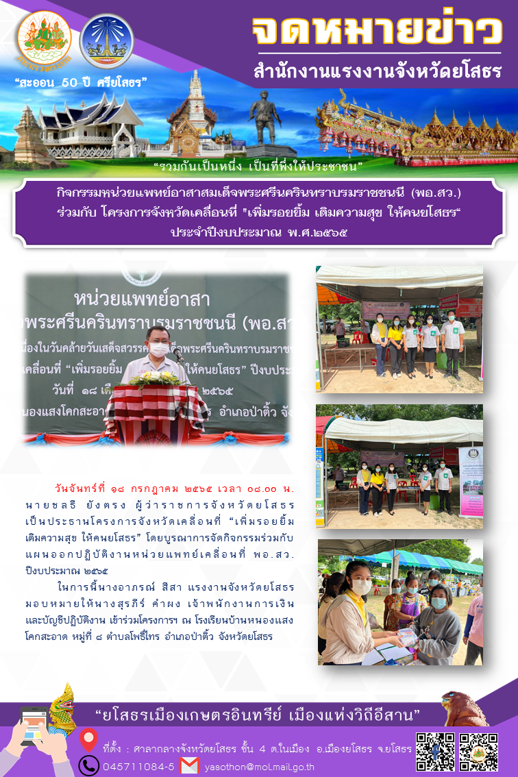 กิจกรรมหน่วยแพทย์อาสาสมเด็จพระศรีนครินทราบรมราชชนนี (พอ.สว.) ร่วมกับ โครงการจังหวัดเคลื่อนที่ “เพิ่มรอยยิ้ม เติมความสุข ให้คนยโสธร“ประจำปีงบประมาณ พ.ศ.๒๕๖๕
