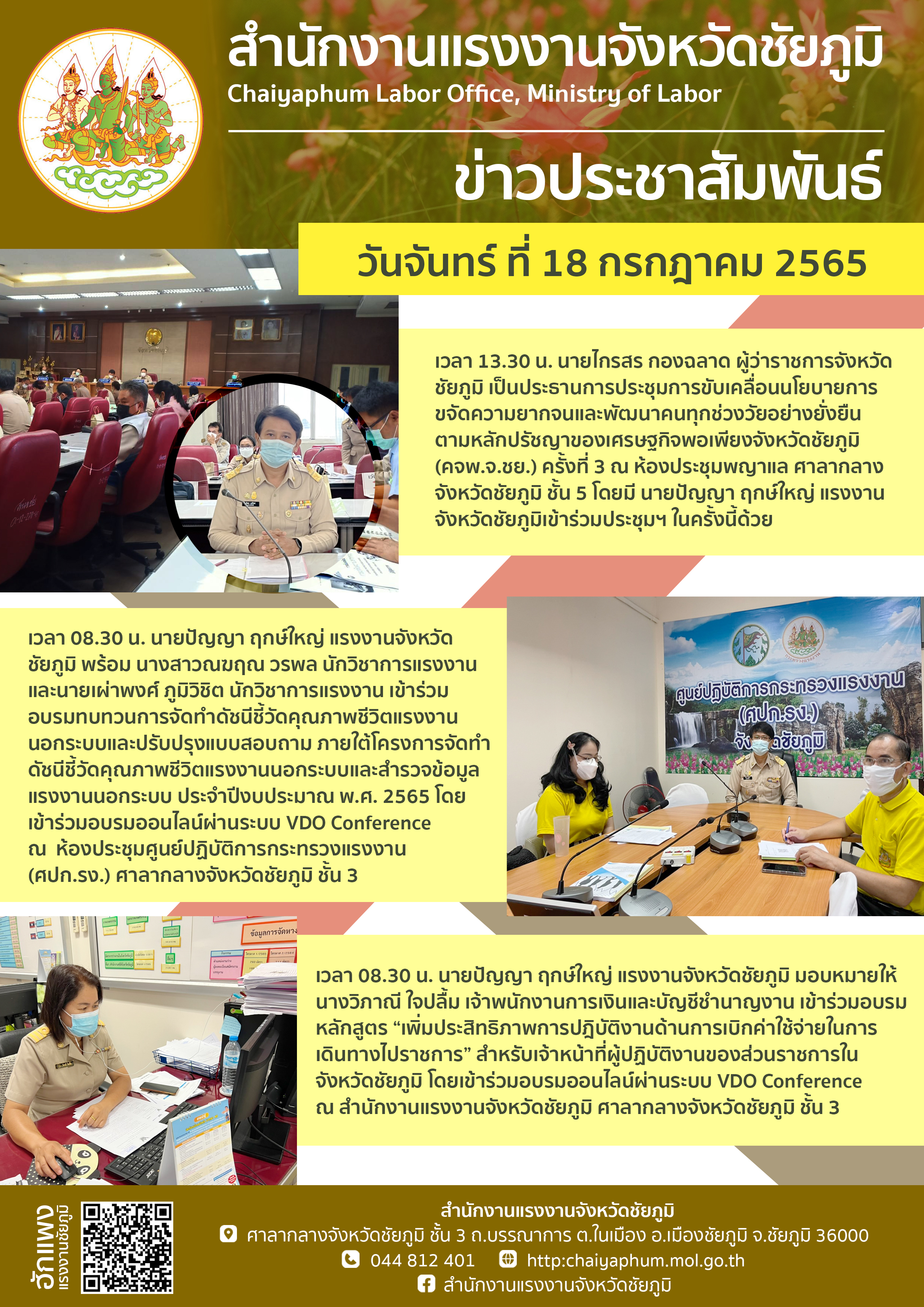 การประชุมการขับเคลื่อนนโยบายการขจัดความยากจนและพัฒนาคนทุกช่วงวัยอย่างยั่งยืน ตามหลักปรัชญาของเศรษฐกิจพอเพียงจังหวัดชัยภูมิ (คจพ.จ.ชย.) ครั้งที่ 3 ณ ห้องประชุมพญาแล ศาลากลางจังหวัดชัยภูมิ ชั้น 5/การอบรมทบทวนการจัดทำดัชนีชี้วัดคุณภาพชีวิตแรงงาน นอกระบบและปรับปรุงแบบสอบถาม ภายใต้โครงการจัดทำดัชนีชี้วัดคุณภาพชีวิตแรงงานนอกระบบและสำรวจข้อมูลแรงงานนอกระบบ ประจำปีงบประมาณ พ.ศ. 2565 โดย เข้าร่วมอบรมออนไลน์ผ่านระบบ VDO Conferenceณ ห้องประชุมศูนย์ปฏิบัติการกระทรวงแรงงาน (ศปก.รง.) ศาลากลางจังหวัดชัยภูมิ ชั้น 3/และการอบรมหลักสูตร “เพิ่มประสิทธิภาพการปฎิบัติงานด้านการเบิกค่าใช้จ่ายในการเดินทางไปราชการ” สำหรับเจ้าหน้าที่ผู้ปฏิบัติงานของส่วนราชการใน จังหวัดชัยภูมิ โดยเข้าร่วมอบรมออนไลน์ผ่านระบบ VDO Conference ณ สำนักงานแรงงานจังหวัดชัยภูมิ ศาลากลางจังหวัดชัยภูมิ ชั้น 3