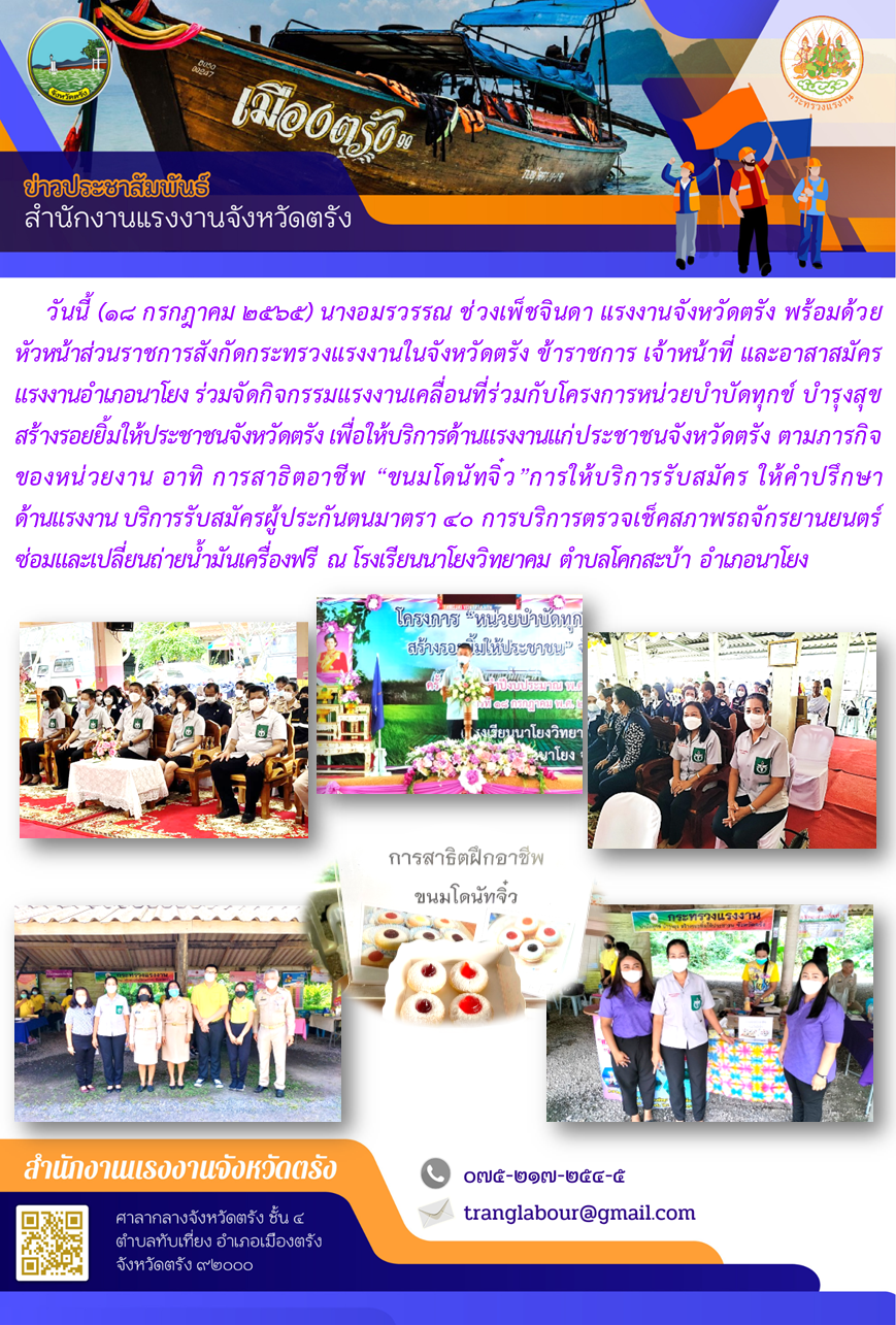 แรงงานจังหวัดตรัง พร้อมด้วยหัวหน้าส่วนราชการสังกัดกระทรวงแรงงานในจังหวัดตรัง ข้าราชการ เจ้าหน้าที่ และอาสาสมัครแรงงานอำเภอนาโยง ร่วมจัดกิจกรรมแรงงานเคลื่อนที่ร่วมกับโครงการหน่วยบำบัดทุกข์ บำรุงสุข สร้างรอยยิ้มให้ประชาชนจังหวัดตรัง ณ โรงเรียนนาโยงวิทยาคม ตำบลโคกสะบ้า อำเภอนาโยง