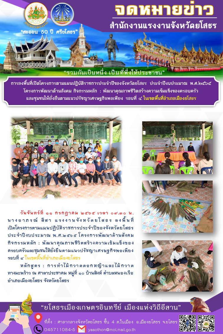 การลงพื้นที่เปิดโครงการตามแผนปฏิบัติราชการประจำปีของจังหวัดยโสธร ประจำปีงบประมาณ พ.ศ.๒๕๖๕ โครงการพัฒนาด้านสังคม กิจกรรมหลัก : พัฒนาคุณภาพชีวิตสร้างความเข้มแข็งของครอบครัวและชุมชนให้ยั่งยืนตามแนวปรัชญาเศรษฐกิจพอเพียง รอบที่ ๔ ในเขตพื้นที่อำเภอเมืองยโสธร