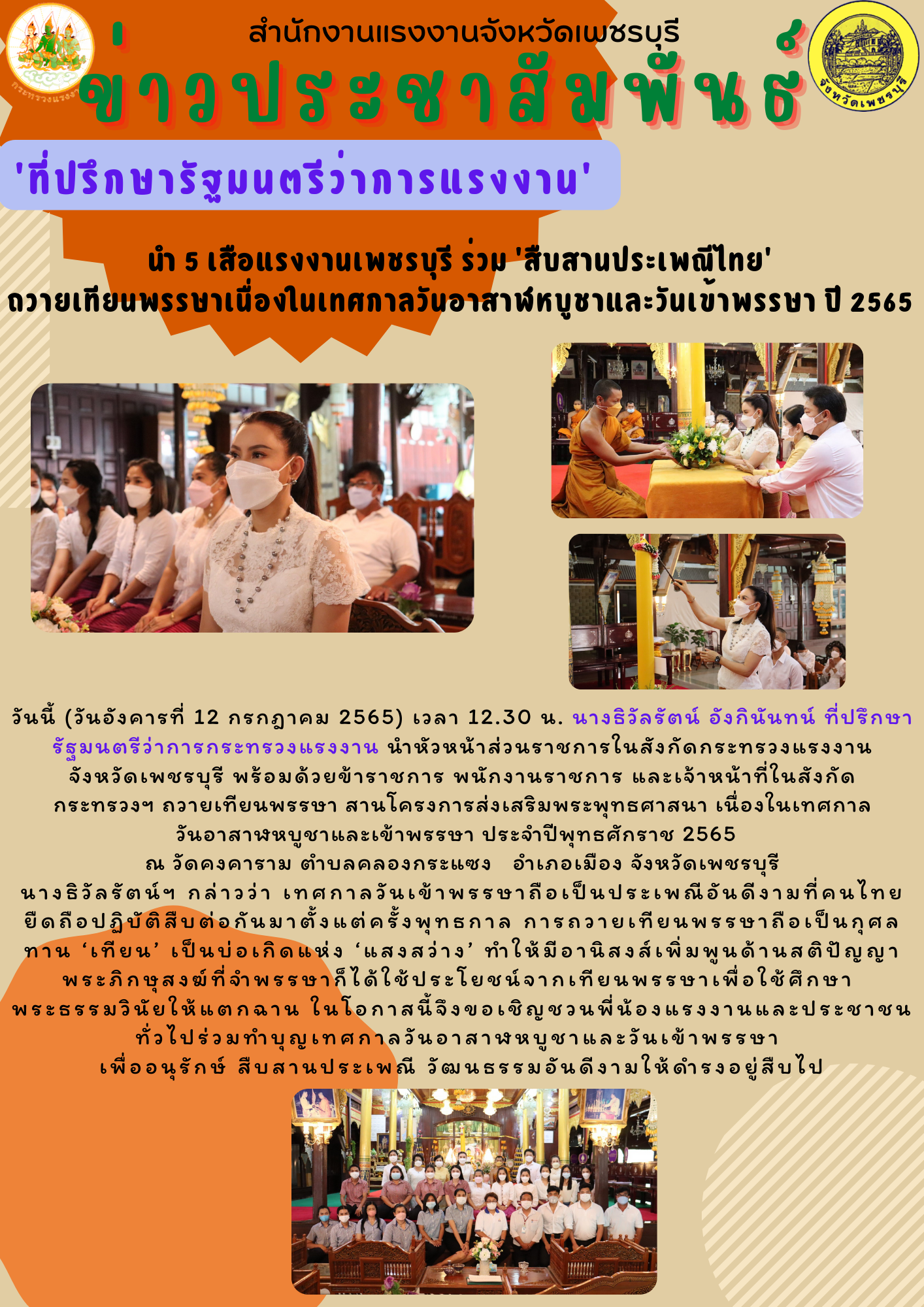 ‘ที่ปรึกษารัฐมนตรีว่าการแรงงาน’ นำ 5 เสือแรงงานเพชรบุรี ร่วม ‘สืบสานประเพณีไทย’ ถวายเทียนพรรษาเนื่องในเทศกาลวันอาสาฬหบูชาและวันเข้าพรรษา ปี 2565
