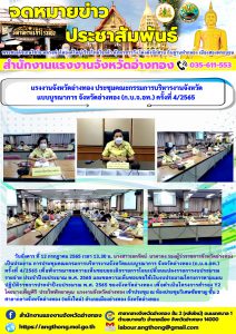 แรงงานจังหวัดอ่างทอง ประชุมคณะกรรมการบริหารงานจังหวัดแบบบูรณาการ จังหวัดอ่างทอง (ก.บ.จ.อท.) ครั้งที่ 4/2565