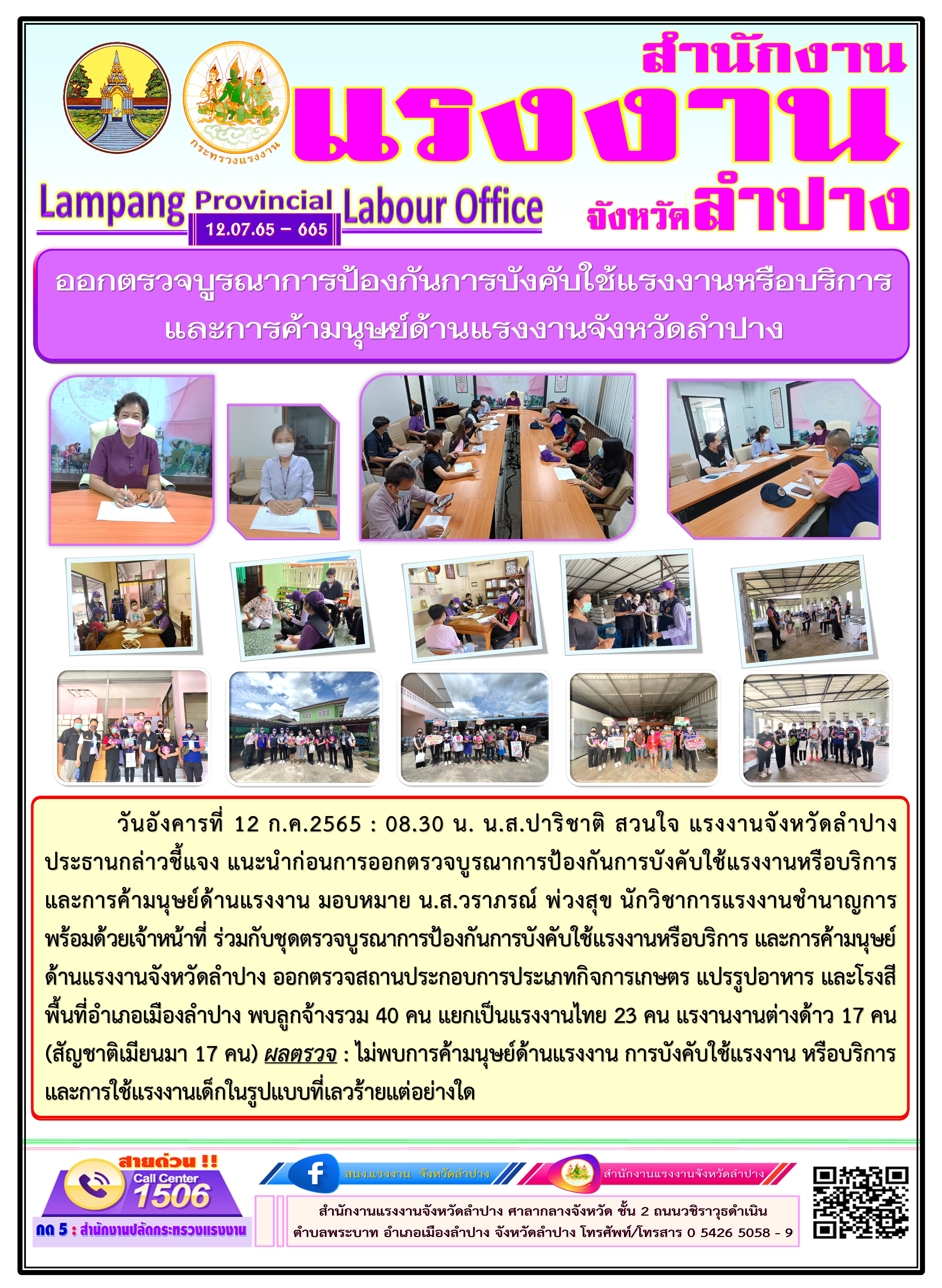 ออกตรวจบูรณาการป้องกันการบังคับใช้แรงงานหรือบริการ และการค้ามนุษย์ด้านแรงงานจังหวัดลำปาง