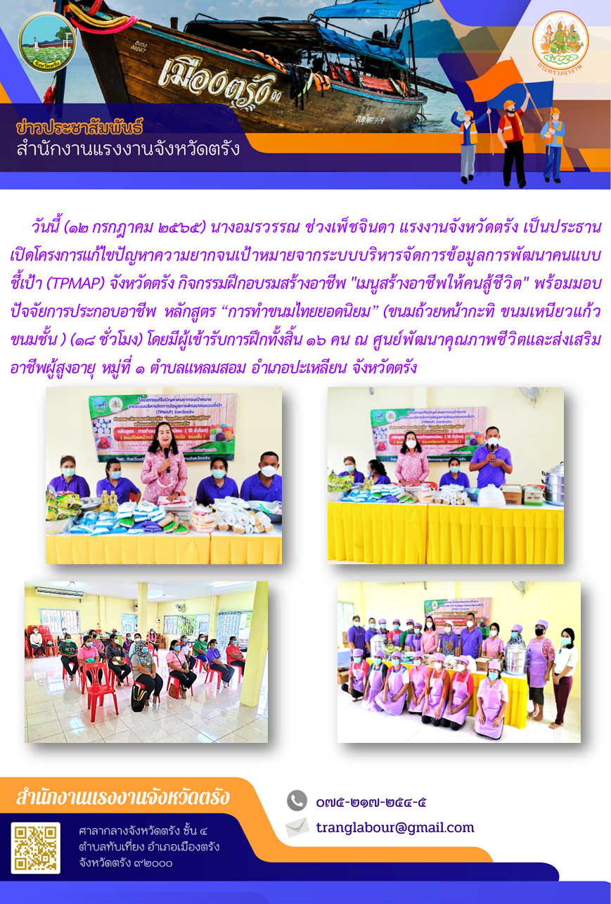 แรงงานจังหวัดตรัง เป็นประธานเปิดโครงการแก้ไขปัญหาความยากจนเป้าหมายจากระบบบริหารจัดการข้อมูลการพัฒนาคนแบบชี้เป้า (TPMAP) จังหวัดตรัง กิจกรรมฝึกอบรมสร้างอาชีพ “เมนูสร้างอาชีพให้คนสู้ชีวิต” พร้อมมอบปัจจัยการประกอบอาชีพ หลักสูตร “การทำขนมไทยยอดนิยม” ณ ศูนย์พัฒนาคุณภาพชีวิตและส่งเสริมอาชีพผู้สูงอายุ