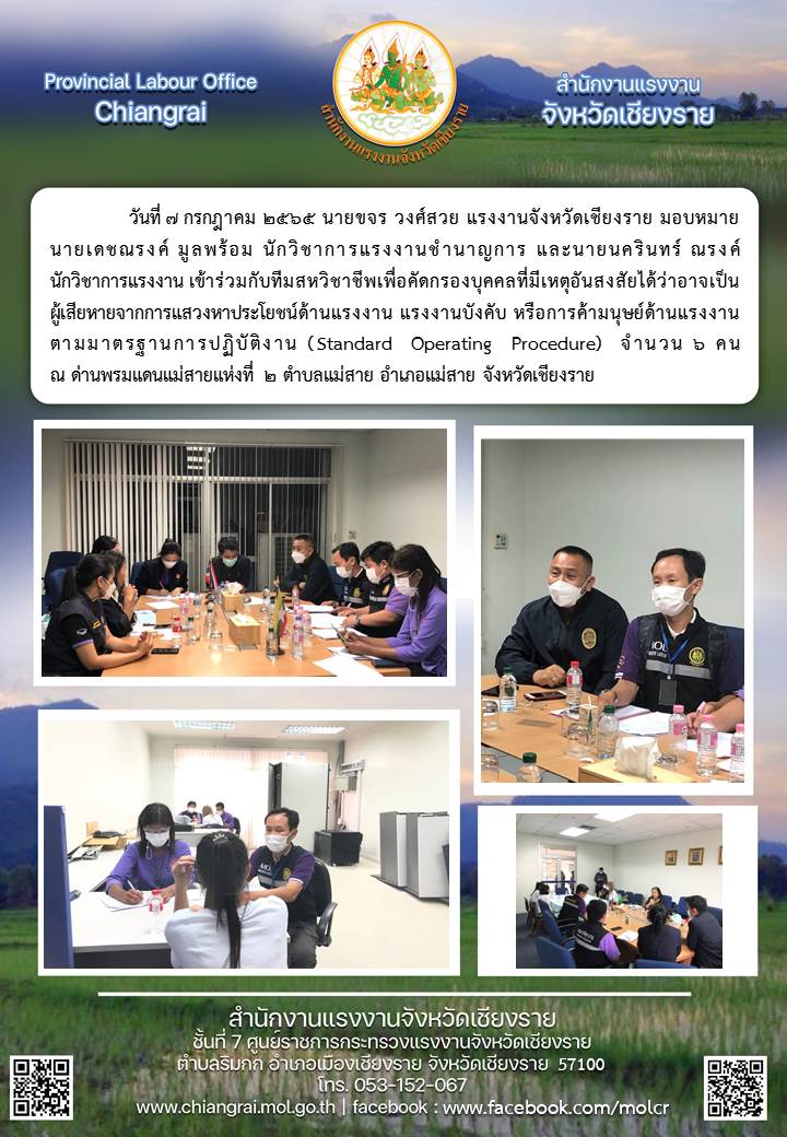 สรจ.ชร เข้าร่วมกับทีมสหวิชาชีพเพื่อคัดกรองบุคคลที่มีเหตุอันสงสัยได้ว่าอาจเป็นผู้เสียหายจากการแสวงหาผลประโยชน์ด้านแรงงาน แรงงานบังคับ หรือการค้ามนุษย์ด้านแรงงาน