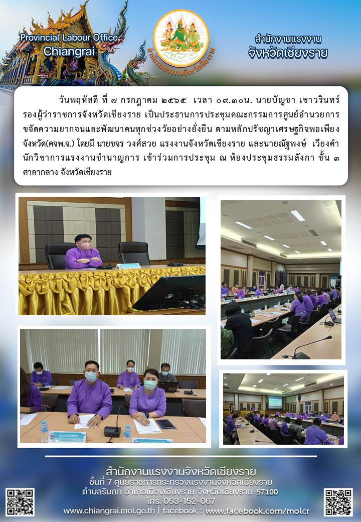 นายบัญชา เชาวรินทร์ รองผู้ว่าราชการจังหวัดเชียงราย เป็นประธานการประชุมคณะกรรมการศูนย์อำนวยการขจัดความยากจนและพัฒนาคนทุกช่วงวัยอย่างยั่งยืน ตามหลักเศรษฐกิจพอเพียงจังหวัด