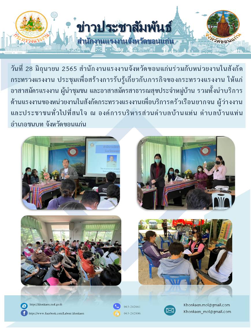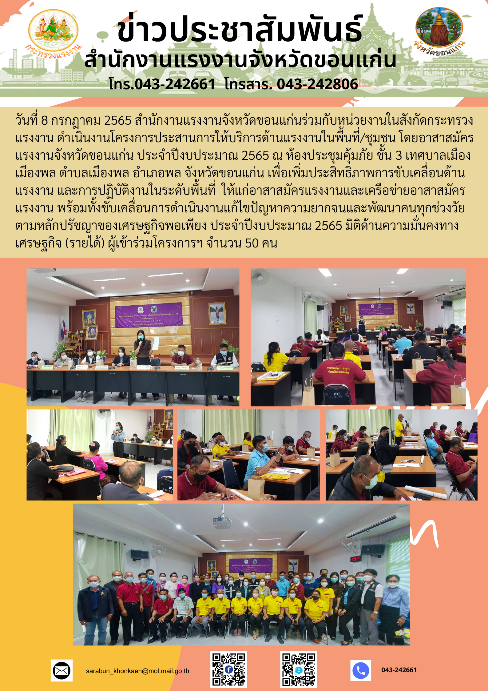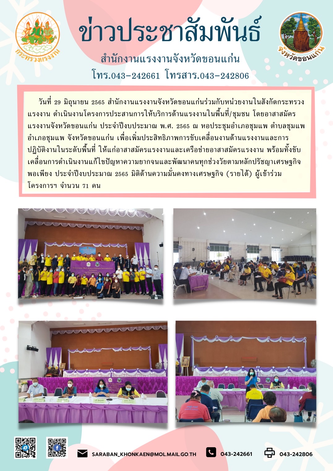 สำนักงานแรงงานจังหวัดขอนแก่น ดำเนินโครงการประสานการให้บริการด้านแรงงานในพื้นที่/ชุมชน โดยอาสาสมัครแรงงานจังหวัดขอนแก่น