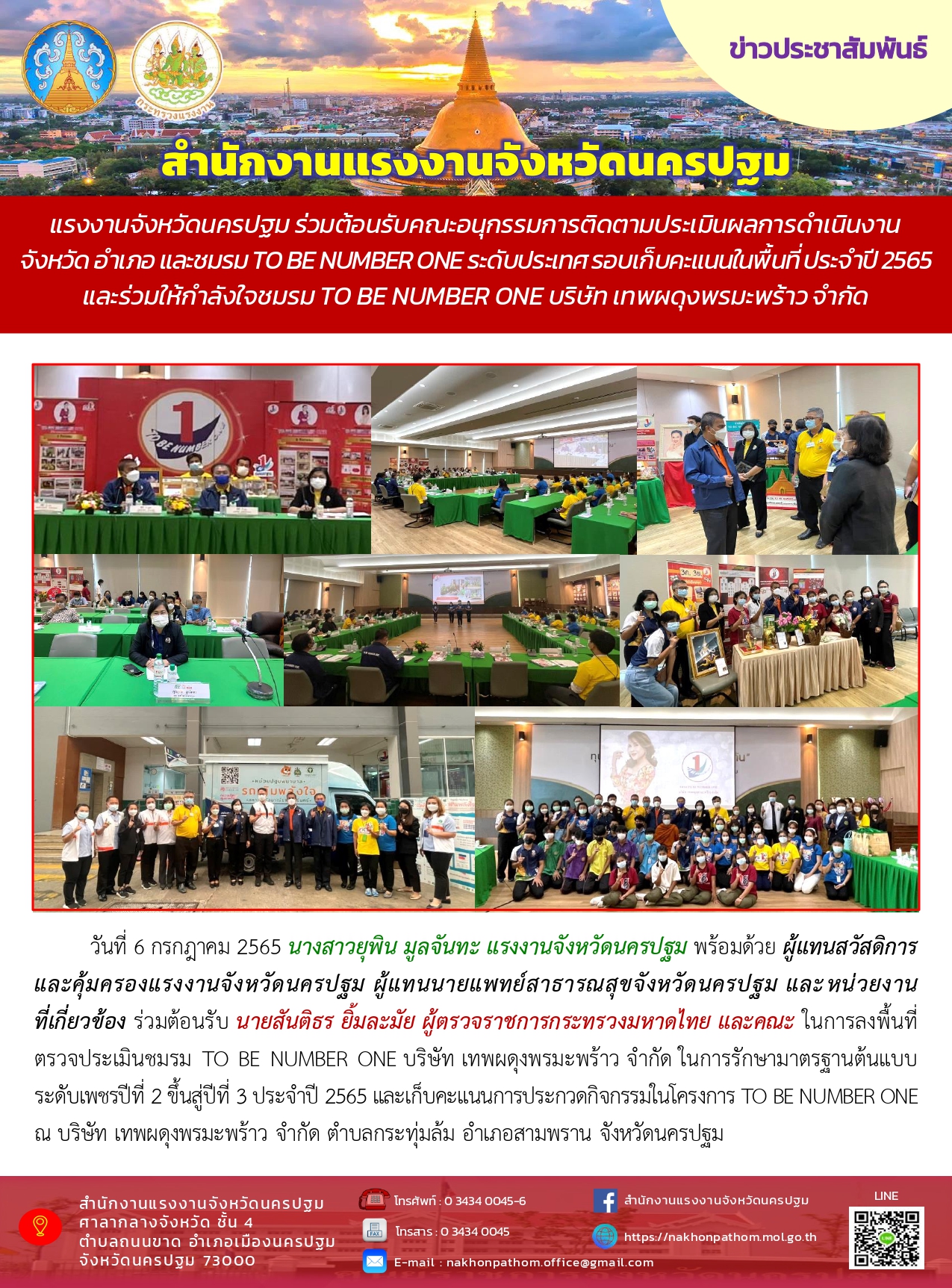แรงงานจังหวัดนครปฐม ร่วมต้อนรับคณะอนุกรรมการติดตามประเมินผลการดำเนินงาน จังหวัด อำเภอ และชมรม TO BE NUMBER ONE ระดับประเทศ รอบเก็บคะแนนในพื้นที่ ประจำปี 2565 และร่วมให้กำลังใจชมรม TO BE NUMBER ONE บริษัท เทพผดุงพรมะพร้าว จำกัด