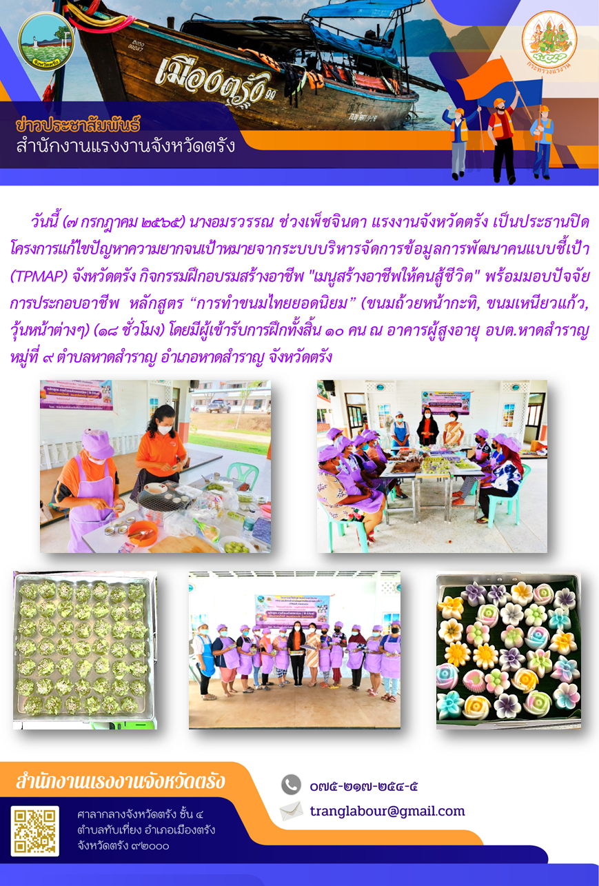 แรงงานจังหวัดตรัง เป็นประธานปิดโครงการแก้ไขปัญหาความยากจนเป้าหมายจากระบบบริหารจัดการข้อมูลการพัฒนาคนแบบชี้เป้า (TPMAP) จังหวัดตรัง กิจกรรมฝึกอบรมสร้างอาชีพ “เมนูสร้างอาชีพให้คนสู้ชีวิต” พร้อมมอบปัจจัยการประกอบอาชีพ หลักสูตร “การทำขนมไทยยอดนิยม”