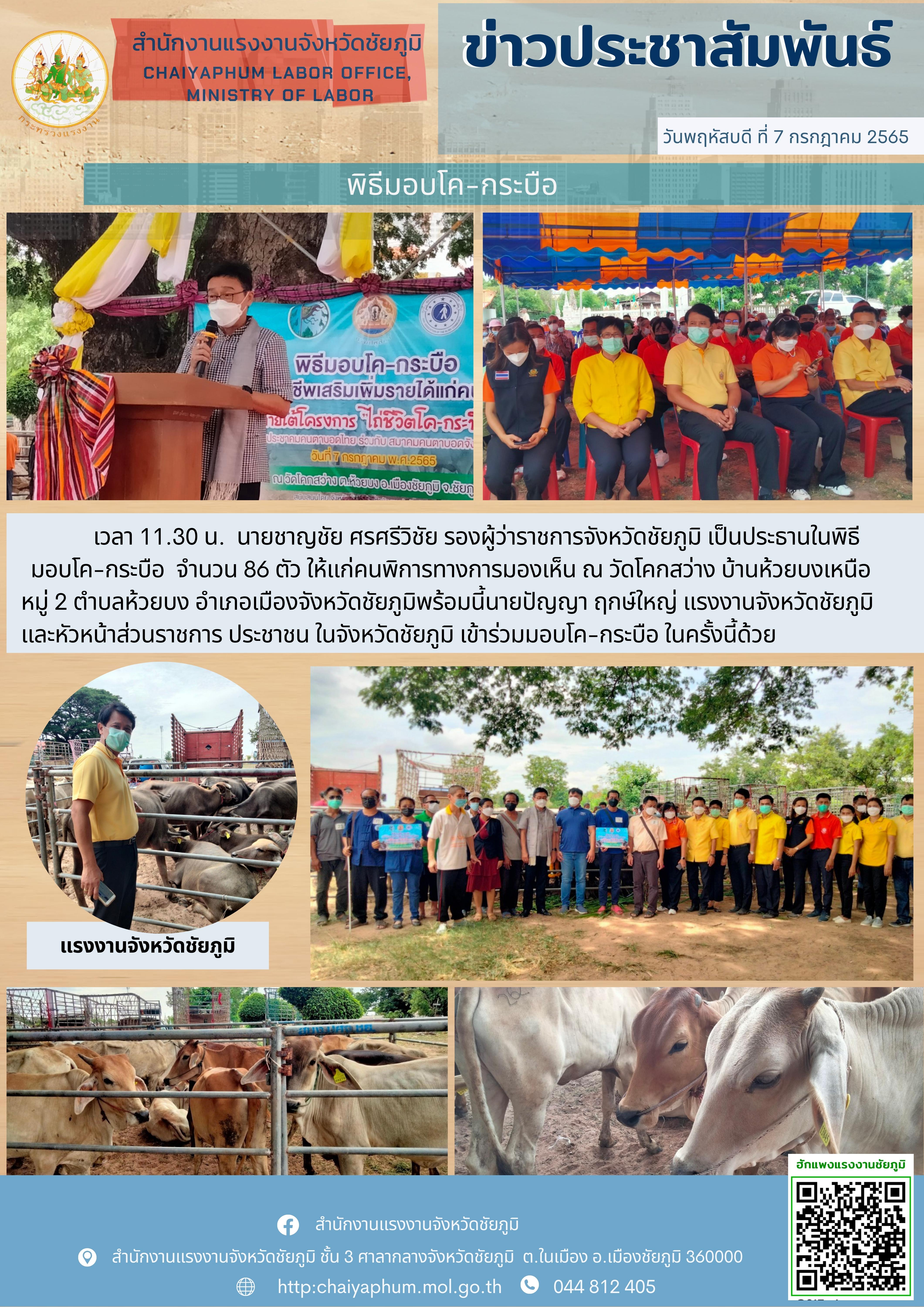 นายชาญชัย ศรศรีวิชัย รองผู้ว่าราชการจังหวัดชัยภูมิ เป็นประธานในพิธีมอบโค-กระบือ จำนวน 86 ตัว ให้แก่คนพิการทางการมองเห็น ณ วัดโคกสว่าง บ้านห้วยบงเหนือ หมู่ 2 ตำบลห้วยบง อำเภอเมืองจังหวัดชัยภูมิ
