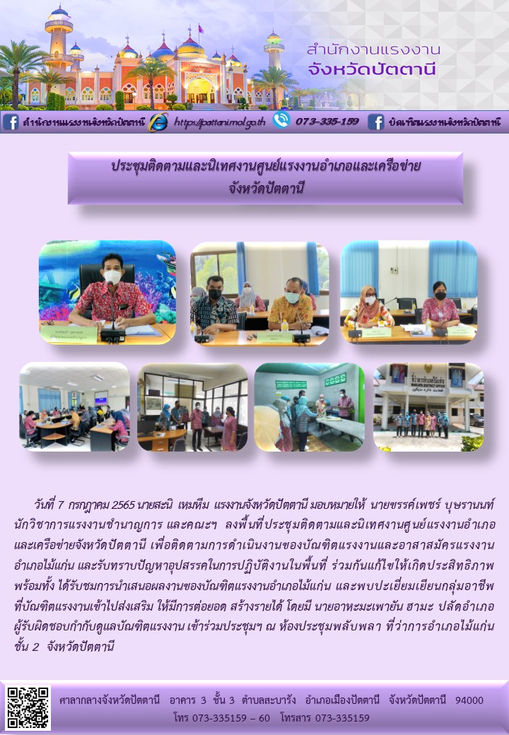 แรงงานจังหวัดยะลา ลงพื้นที่ติดตามเเละนิเทศงานบัณฑิตแรงงานอำเภอกรงปินัง จังหวัดยะลา ตามโครงการ “ติดตามผลการดำเนินงานเเละนิเทศบัณฑิตแรงงานจังหวัดยะลา ประจำปีงบประมาณ พ.ศ. 2565”