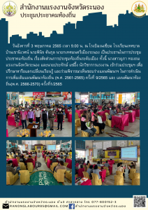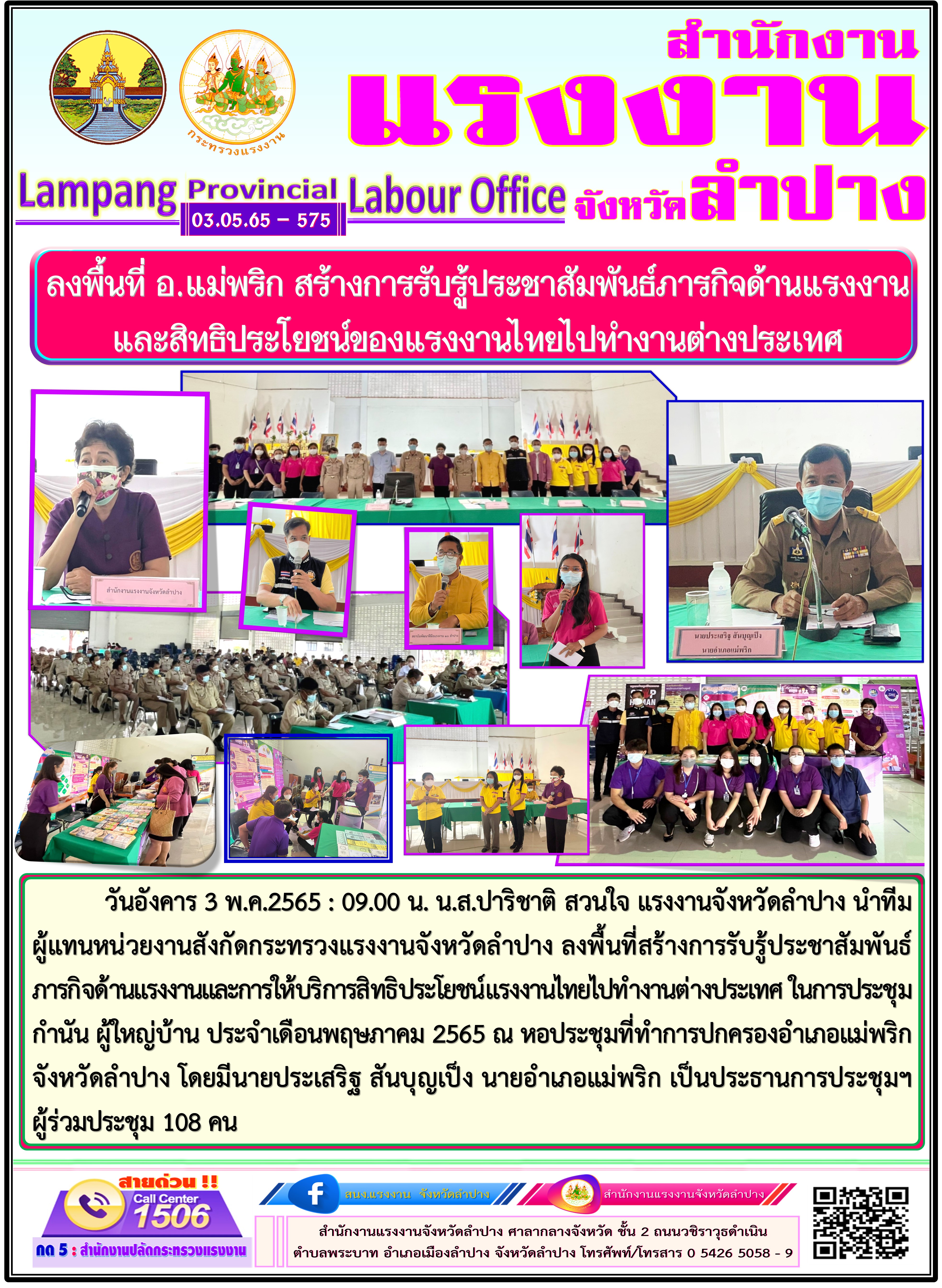 แรงงานจังหวัดลำปาง ลงพื้น อ .แม่พริก ที่สร้างการรับรู้ประชาสัมพันธ์ภารกิจด้านแรงงานและการให้บริการสิทธิประโยชน์แรงงานไทยไปทำงานต่างประเทศ