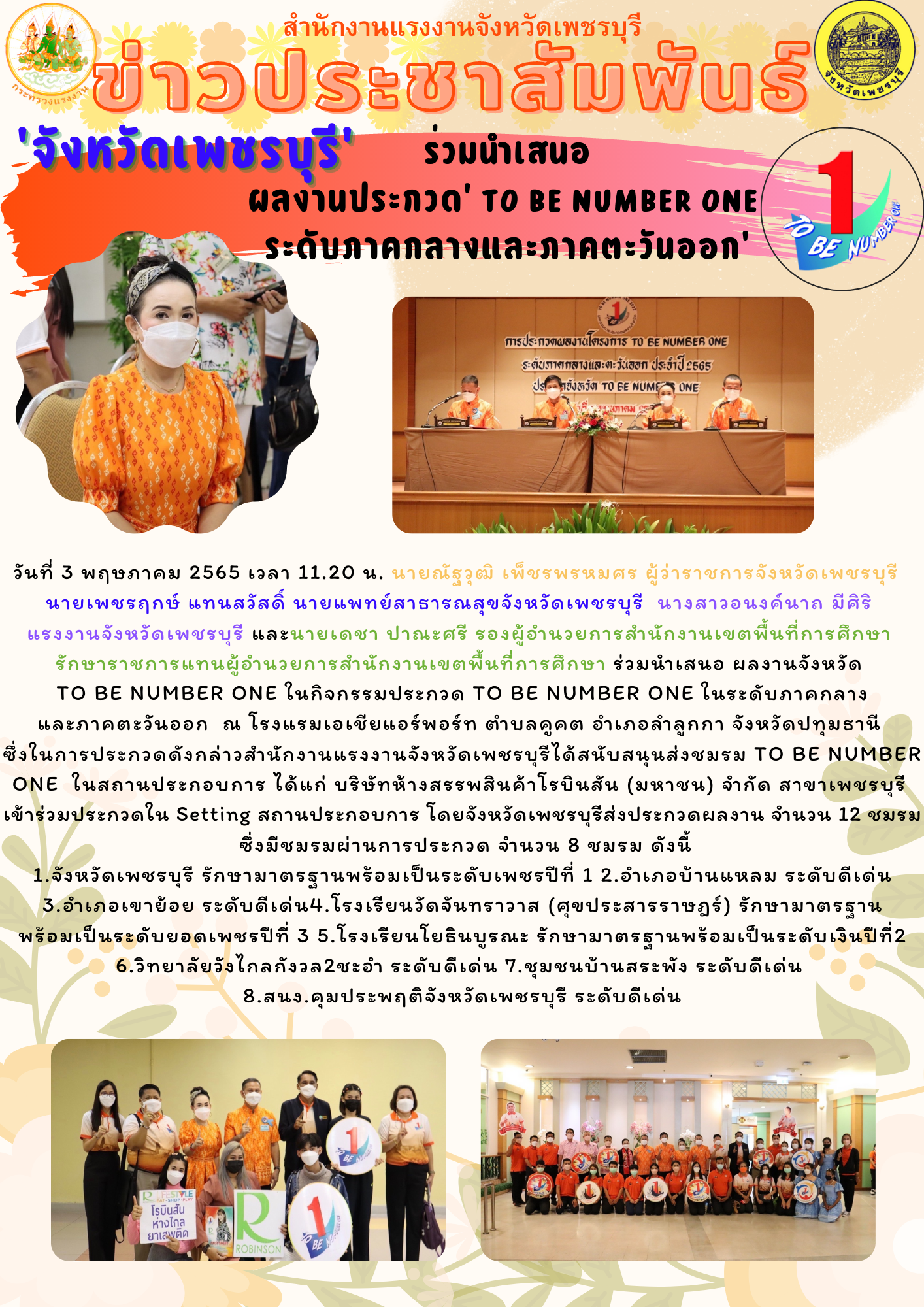 ผู้ว่าราชการจังหวัดสุพรรณบุรี พร้อมด้วยแรงงานจังหวัดสุพรรณบุรี ศึกษาธิการจังหวัดสุพรรณบุรี และรองนายแพทย์สาธารณสุขจังหวัดสุพรรณบุรี ร่วมนำเสนอผลการดำเนินงานจังหวัด TO BE NUMBER ONE ระดับภาคกลางและภาคตะวันออก ประจำปี พ.ศ.2565