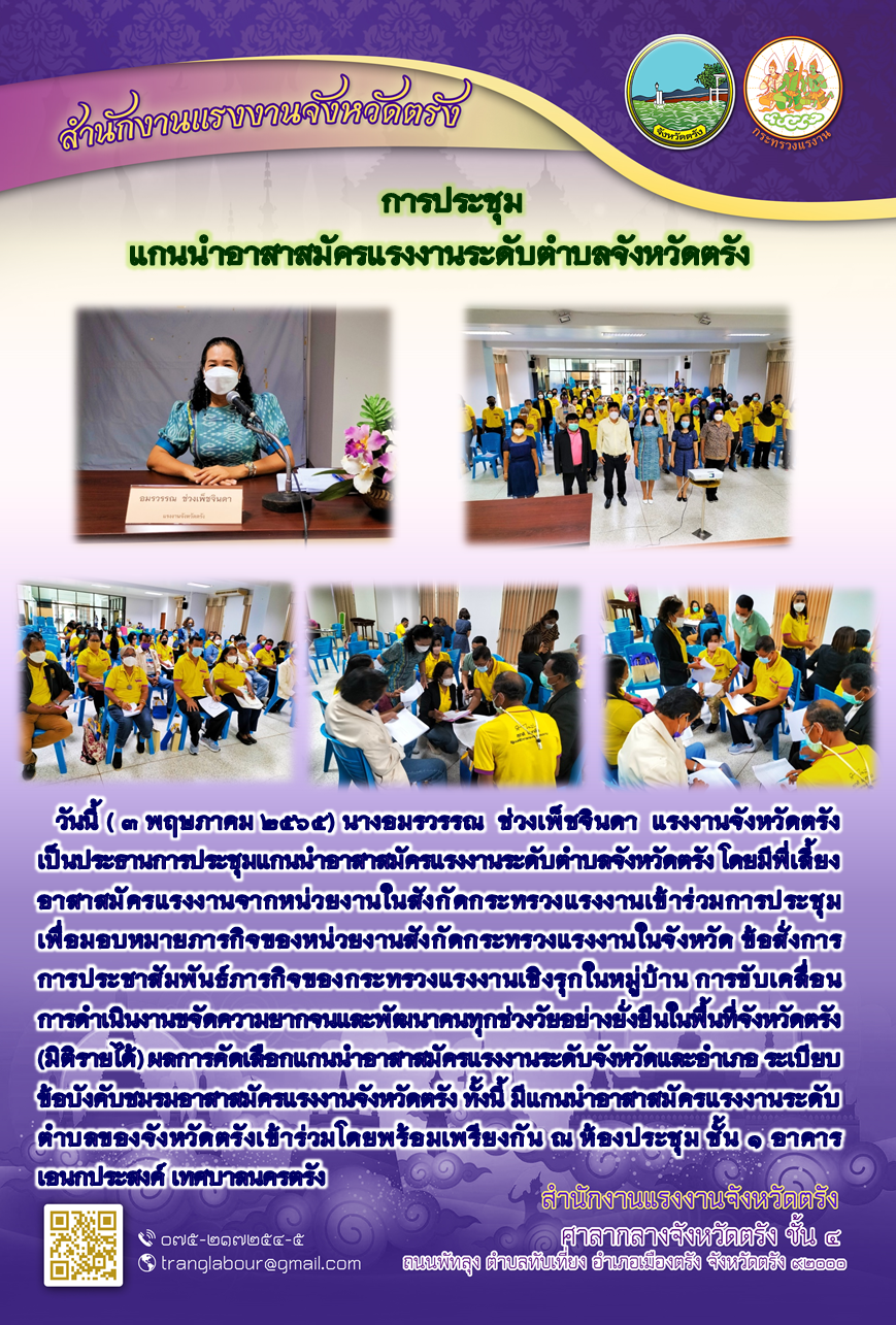 การประชุมแกนนำอาสาสมัครแรงงานระดับตำบลจังหวัดตรัง ครั้งที่ 3/2565