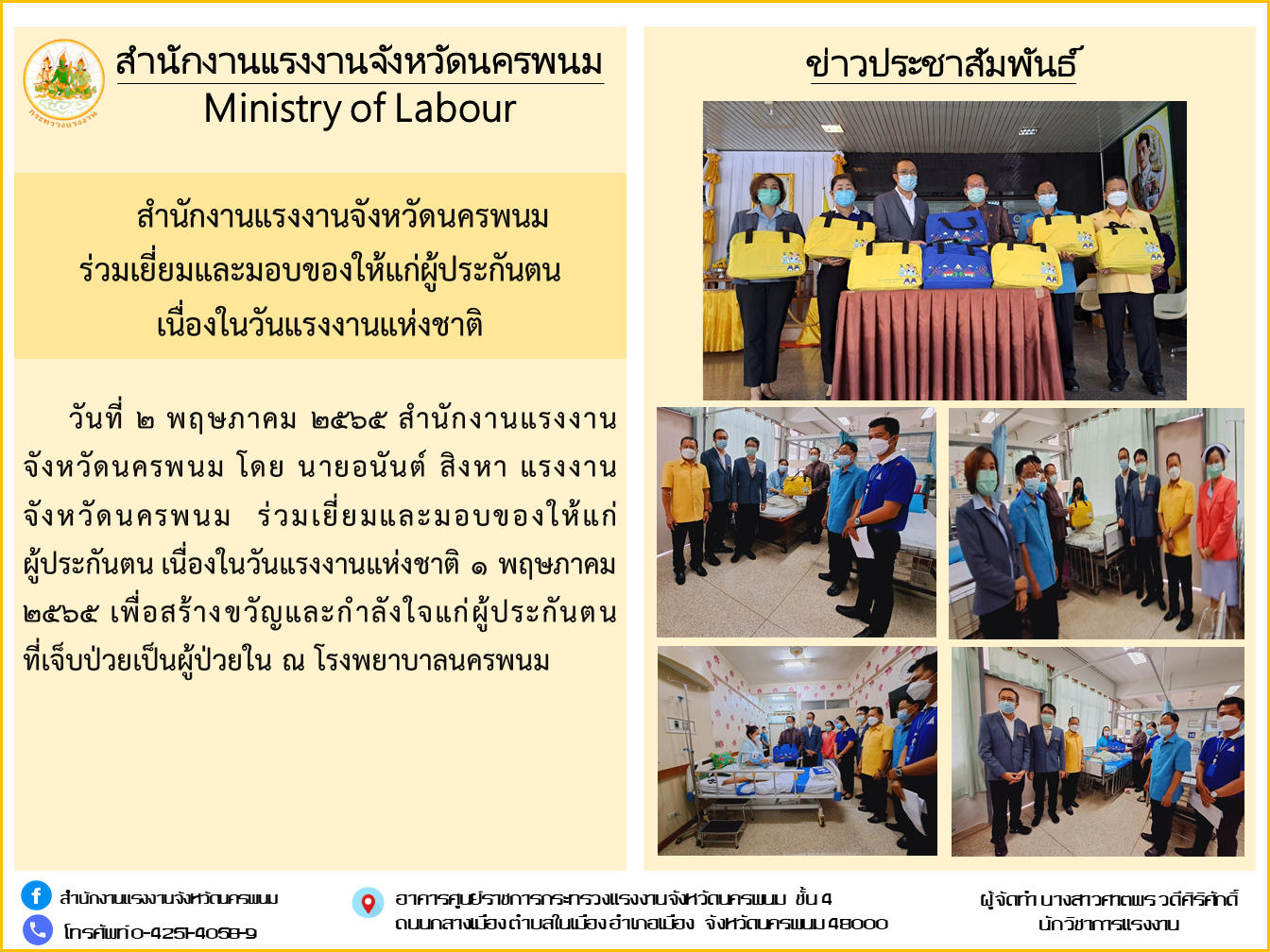 สำนักงานแรงงานจังหวัดนครพนม ร่วมเยี่ยมและมอบของให้แก่ผู้ประกันตน เนื่องในวันแรงงานแห่งชาติ 1 พฤษภาคม 2565