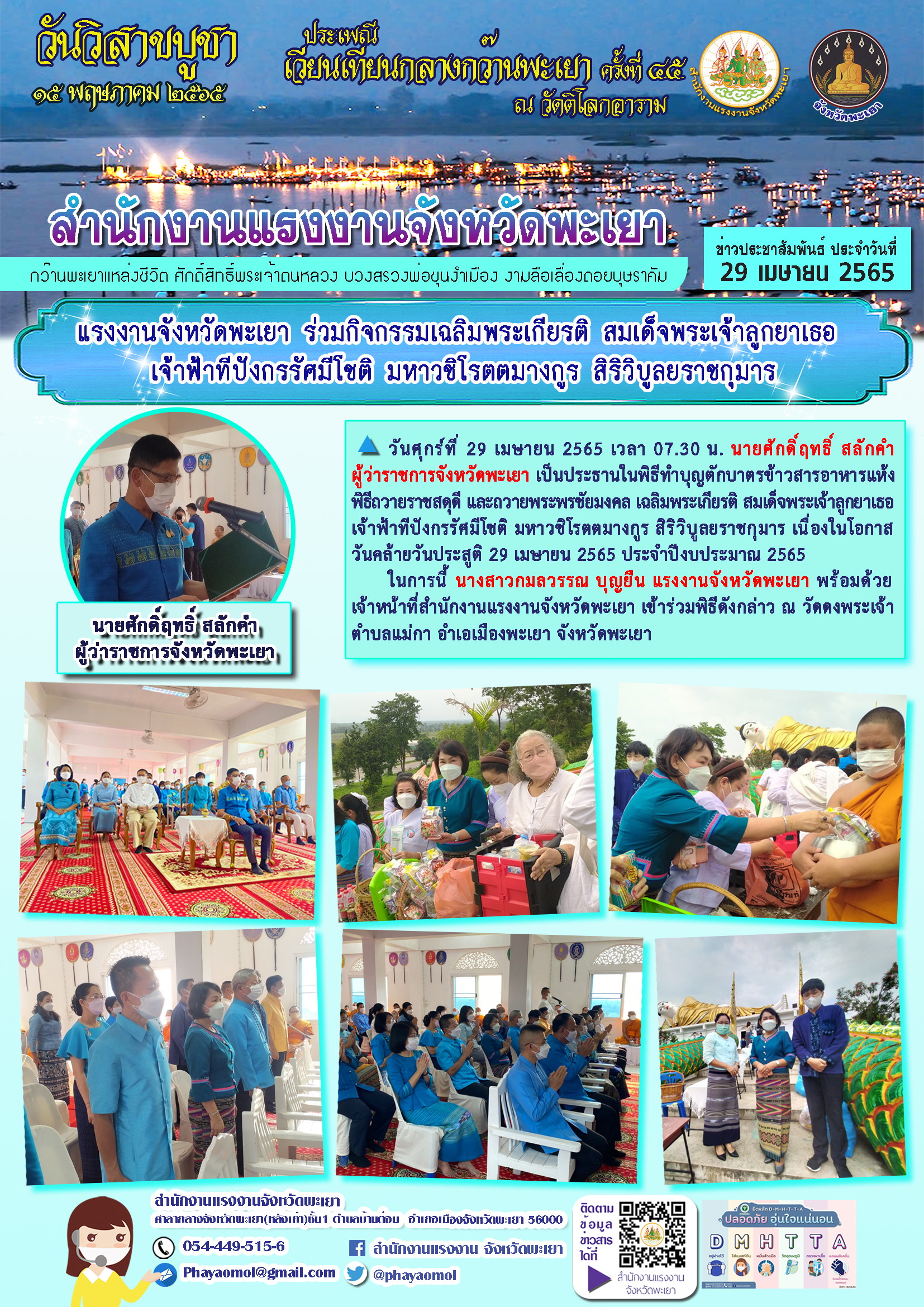 แรงงานจังหวัดพะเยา ร่วมกิจกรรมเฉลิมพระเกียรติ สมเด็จพระเจ้าลูกยาเธอ เจ้าฟ้าทีปังกรรัศมีโชติ มหาวชิโรตตมางกูร สิริวิบูลยราชกุมาร