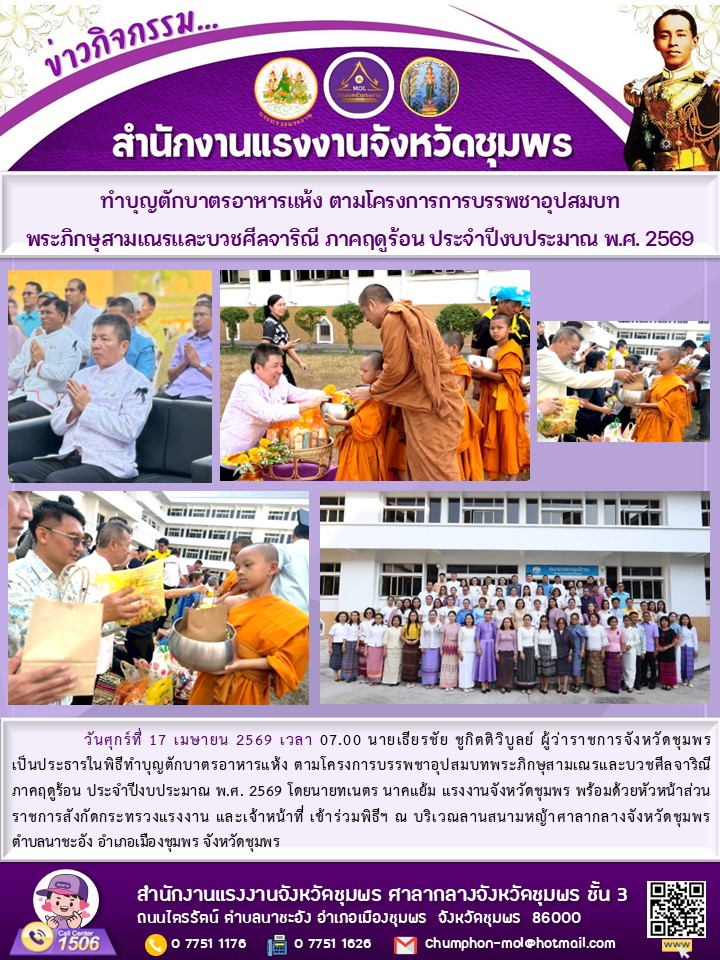 แรงงานจังหวัดชุมพร พร้อมด้วยหัวหน้าส่วนราชการสังกัดกระทรวงแรงงานจังหวัดชุมพร และเจ้าหน้าที่ ร่วมพิธีทำบุญตักบาตรอาหารแห้ง ตามโครงการการบรรพชาอุปสมบท พระภิกษุสามเณรและบวชศีลจาริณี ภาคฤดูร้อน ประจำปีงบประมาณ พ.ศ. 2569