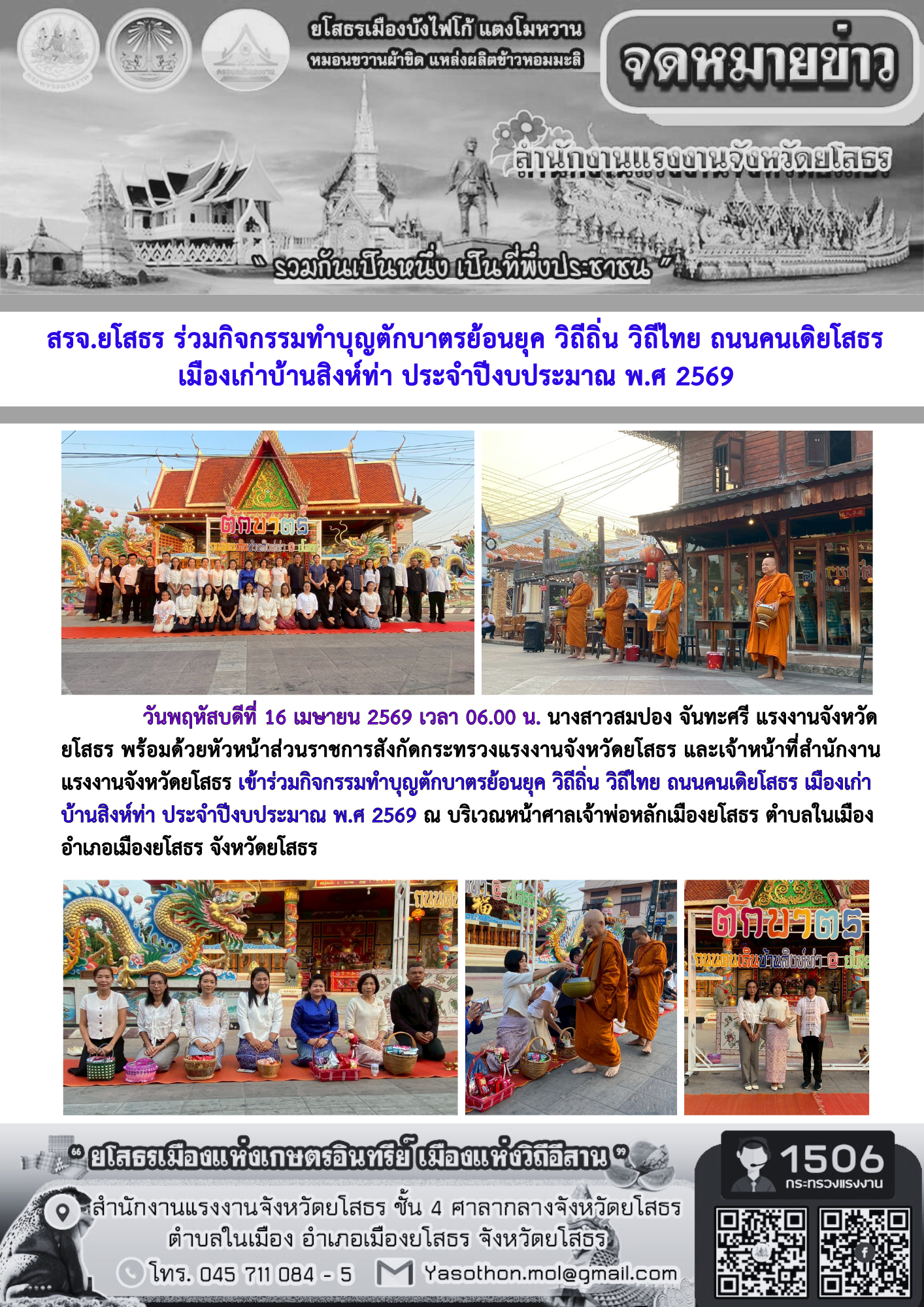 สรจ.ยโสธร ร่วมกิจกรรมทำบุญตักบาตรย้อนยุค วิถีถิ่น วิถีไทย ถนนคนเดิยโสธร เมืองเก่าบ้านสิงห์ท่า ประจำปีงบประมาณ พ.ศ 2569