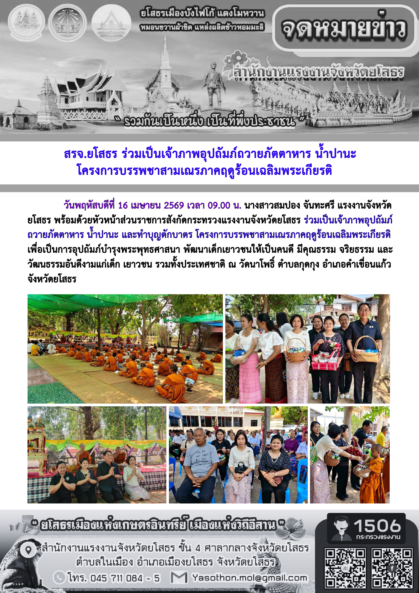สรจ.ยโสธร ร่วมเป็นเจ้าภาพอุปถัมภ์ถวายภัตตาหาร น้ำปานะ โครงการบรรพชาสามเณรภาคฤดูร้อนเฉลิมพระเกียรติ