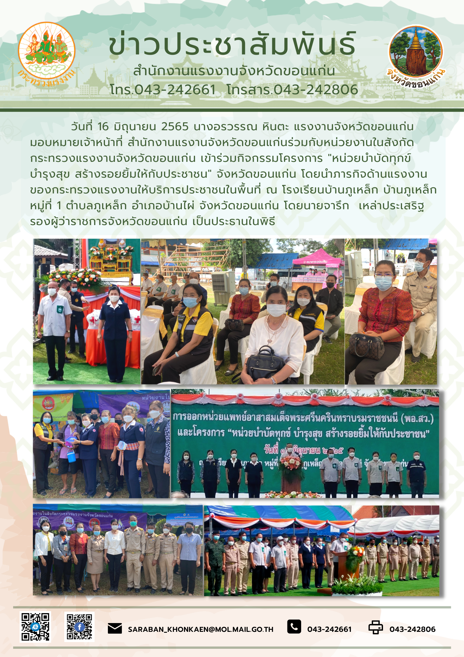 สำนักงานแรงงานจังหวัดขอนแก่นร่วมกิจกรรมโครงการ “หน่วยบำบัดทุกข์ บำรุงสุข สร้างรอยยิ้มให้กับประชาชน” จังหวัดขอนแก่น