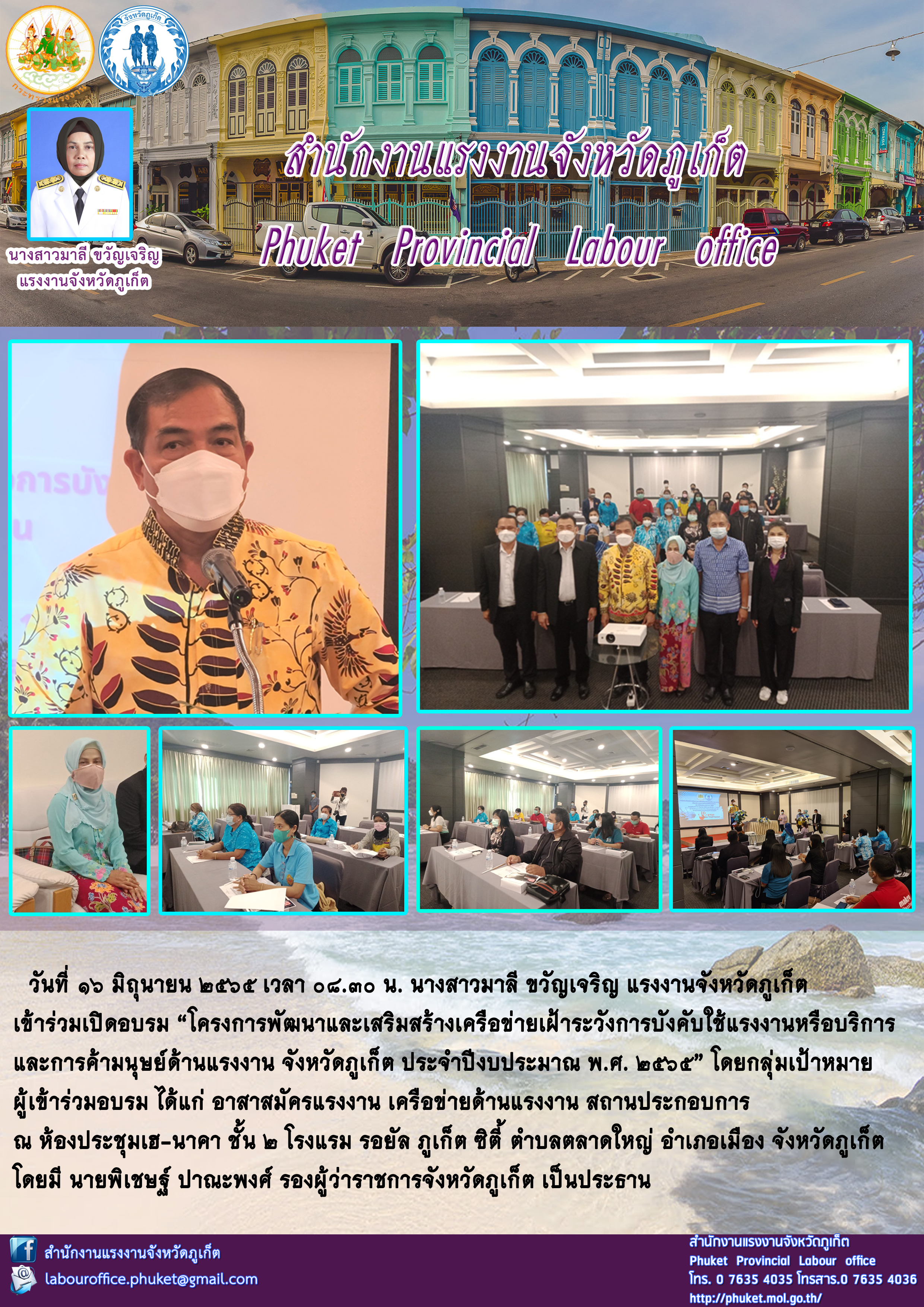 แรงงานจังหวัดภูเก็ต เข้าร่วมเปิดอบรม “โครงการพัฒนาและเสริมสร้างเครือข่ายเฝ้าระวังการบังคับใช้แรงงานหรือบริการและการค้ามนุษย์ด้านแรงงาน จังหวัดภูเก็ต ประจำปีงบประมาณ พ.ศ. 2565”
