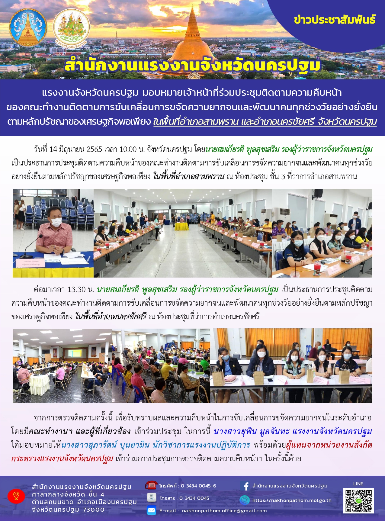 แรงงานจังหวัดนครปฐม มอบหมายเจ้าหน้าที่ร่วมประชุมติดตามความคืบหน้าของคณะทำงานติดตามการขับเคลื่อนการขจัดความยากจนและพัฒนาคนทุกช่วงวัยอย่างยั่งยืนตามหลักปรัชญาของเศรษฐกิจพอเพียง ในพื้นที่อำเภอสามพราน และอำเภอนครชัยศรี จังหวัดนครปฐม