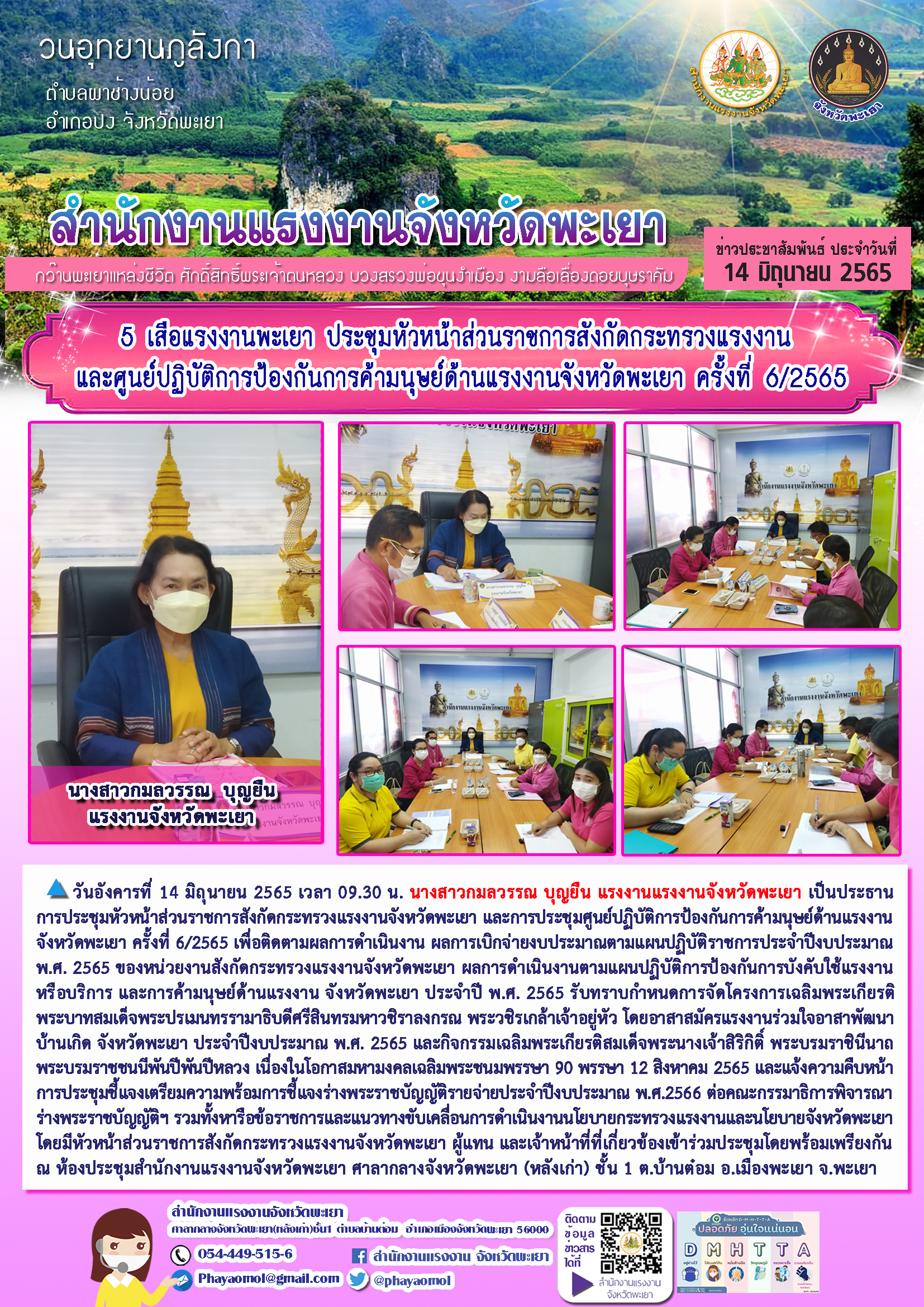 5 เสือแรงงานพะเยา ประชุมหัวหน้าส่วนราชการสังกัดกระทรวงแรงงาน และศูนย์ปฏิบัติการป้องกันการค้ามนุษย์ด้านแรงงานจังหวัดพะเยา ครั้งที่ 6/2565