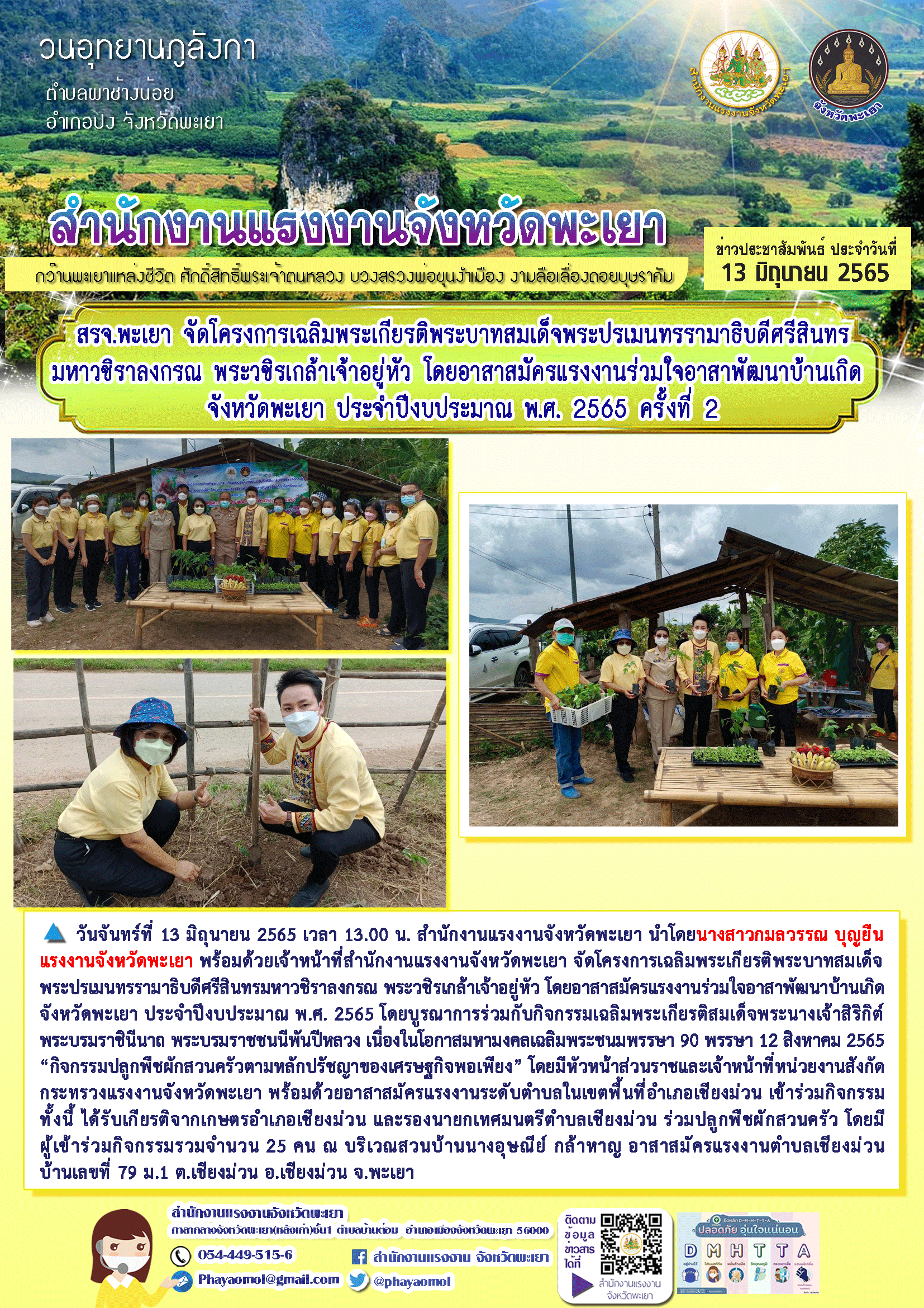สรจ.พะเยา จัดโครงการเฉลิมพระเกียรติพระบาทสมเด็จพระปรเมนทรรามาธิบดีศรีสินทรมหาวชิราลงกรณ พระวชิรเกล้าเจ้าอยู่หัว โดยอาสาสมัครแรงงานร่วมใจอาสาพัฒนาบ้านเกิด จังหวัดพะเยา ประจำปีงบประมาณ พ.ศ. 2565 ครั้งที่ 2