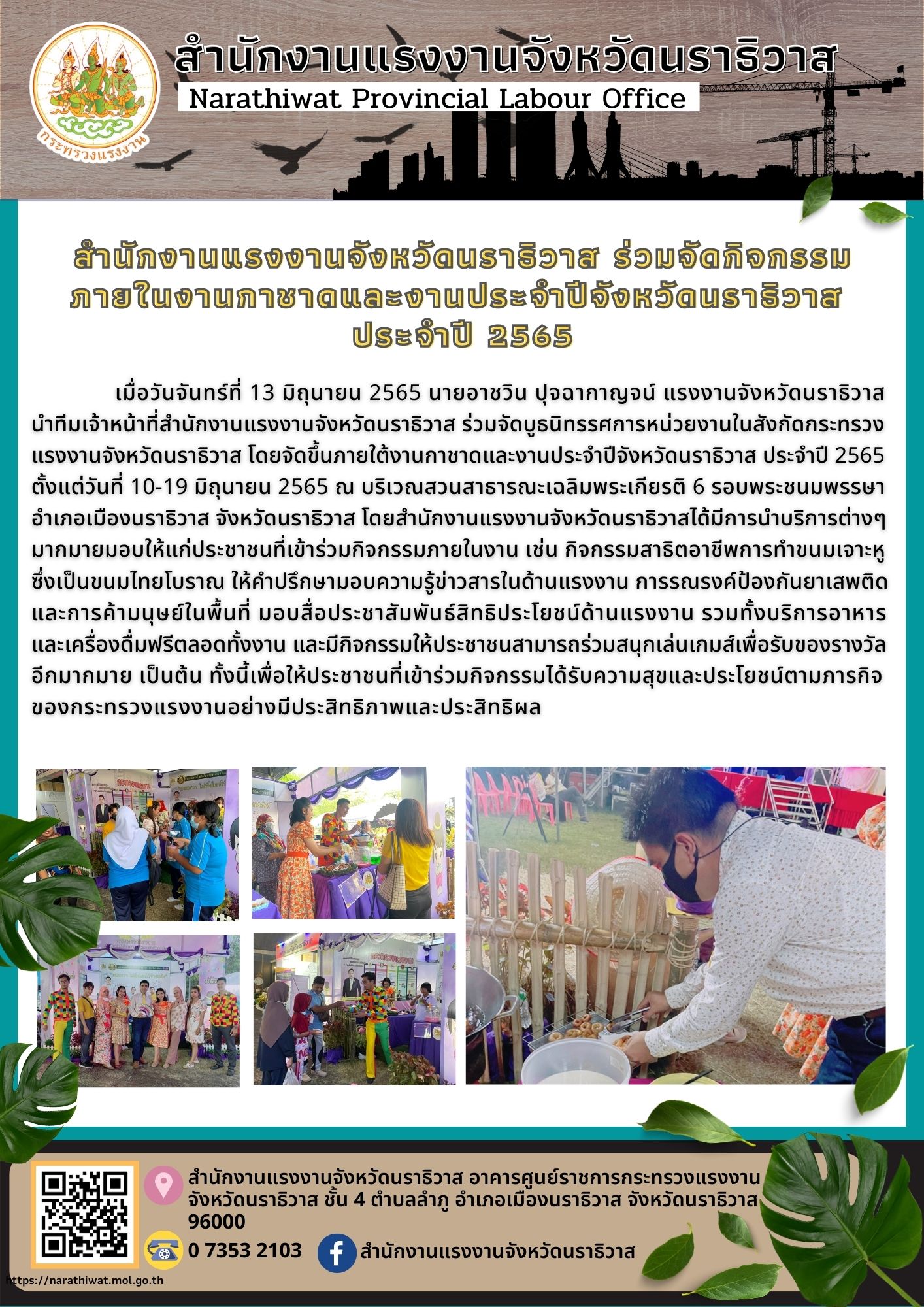 สำนักงานแรงงานจังหวัดนราธิวาส ร่วมจัดกิจกรรมภายในงานกาชาดและงานประจำปีจังหวัดนราธิวาส ประจำปี 2565