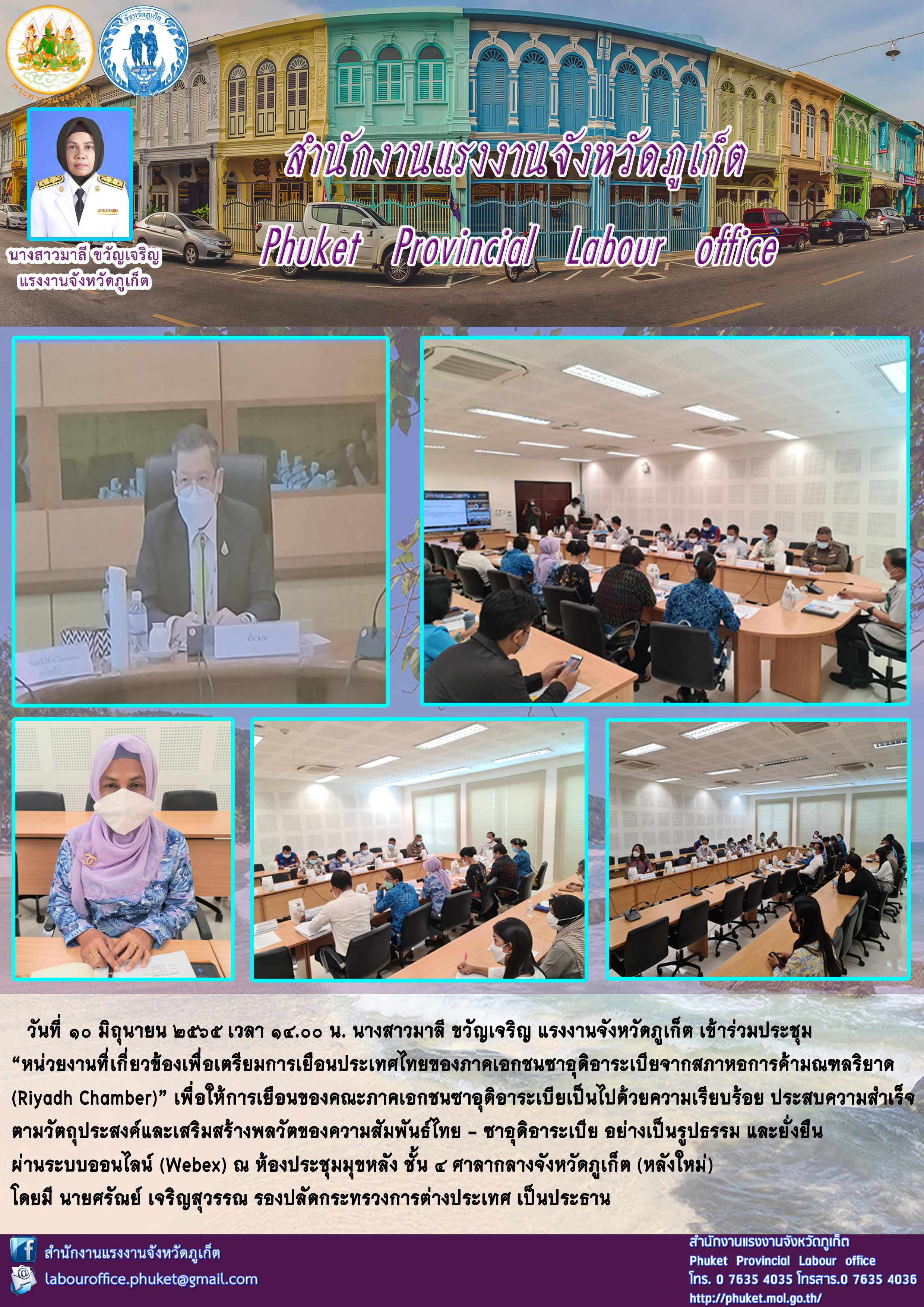 นางสาวมาลี ขวัญเจริญ แรงงานจังหวัดภูเก็ต เข้าร่วมประชุม “หน่วยงานที่เกี่ยวข้องเพื่อเตรียมการเยือนประเทศไทยของภาคเอกชนซาอุดิอาระเบียจากสภาหอการค้ามณฑลริยาด (Riyadh Chamber)”