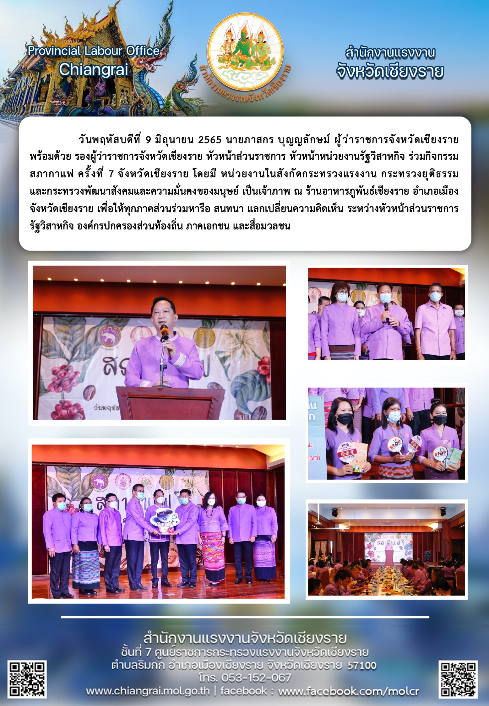 นายภาสกร บุญญลักษณ์ ผู้ว่าราชการจังหวัดเชียงราย พร้อมด้วยรองผู้ราชการจังหวัดเชียงราย หัวหน้าส่วนราชการ หัวหน้าหน่วยงานรัฐวิสาหกิจ ร่วมกิจกรรมสภากาแฟ ครั้งที่ 7 จังหวัดเชียงราย