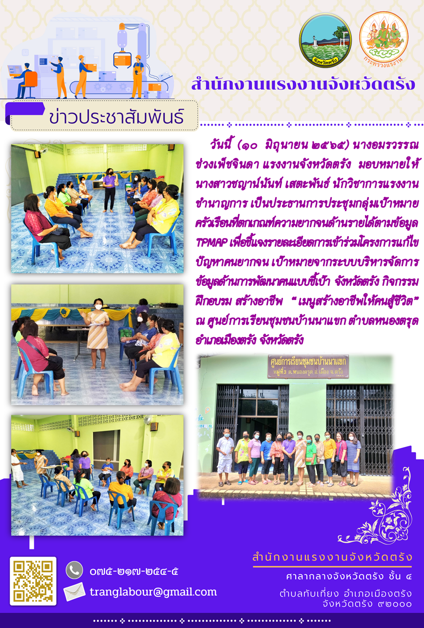 แรงงานจังหวัดตรัง มอบหมายให้ นางสาวชญาน์นันท์ เสตะพันธ์ นักวิชาการแรงงานชำนาญการ เป็นประธานการประชุมกลุ่มเป้าหมายครัวเรือนที่ตกเกณฑ์ความยากจนด้านรายได้ตามข้อมูล TPMAP