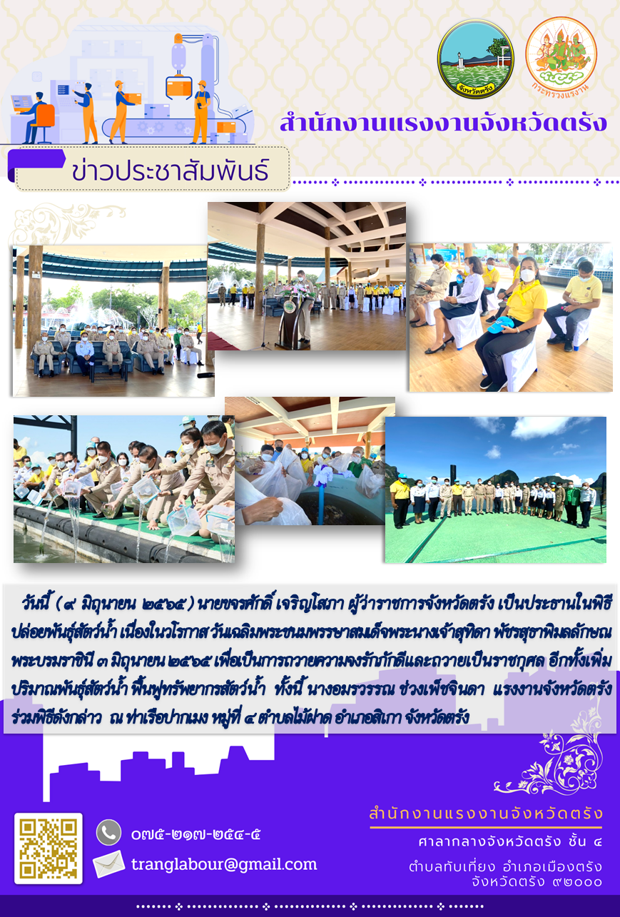 แรงงานจังหวัดตรัง ร่วมพิธีปล่อยพันธุ์สัตว์น้ำ เนื่องในวโรกาส วันเฉลิมพระชนมพรรษาสมเด็จพระนางเจ้าสุทิดา พัชรสุธาพิมลลักษณ พระบรมราชินี 3 มิถุนายน 2565