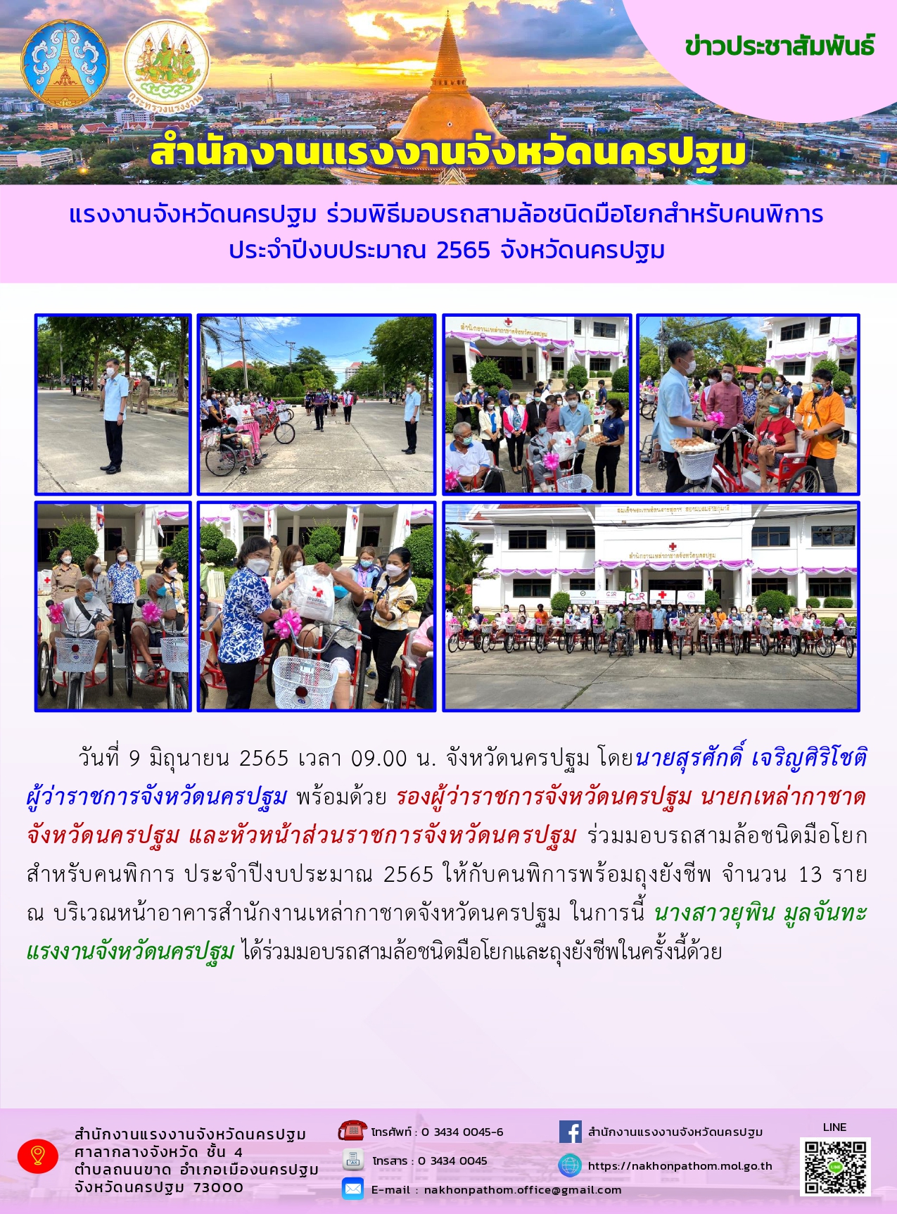 แรงงานจังหวัดนครปฐม ร่วมพิธีมอบรถสามล้อชนิดมือโยกสำหรับคนพิการ ประจำปีงบประมาณ 2565 จังหวัดนครปฐม