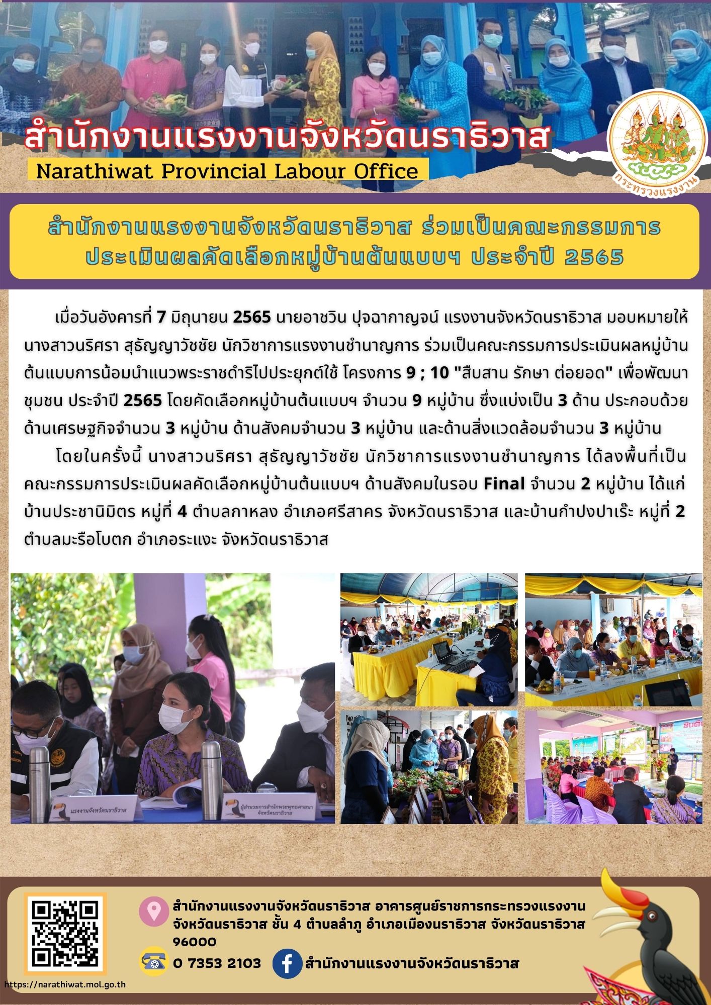 สำนักงานแรงงานจังหวัดนราธิวาส ร่วมเป็นคณะกรรมการประเมินผลคัดเลือกหมู่บ้านต้นแบบฯ ประจำปี 2565