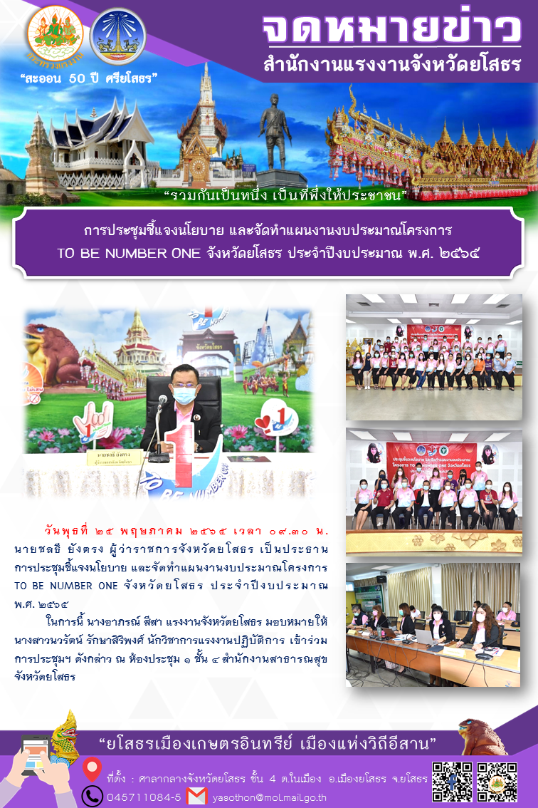 การประชุมชี้แจงนโยบาย และจัดทำแผนงานงบประมาณโครงการ TO BE NUMBER ONE จังหวัดยโสธร ประจำปีงบประมาณ พ.ศ.2565