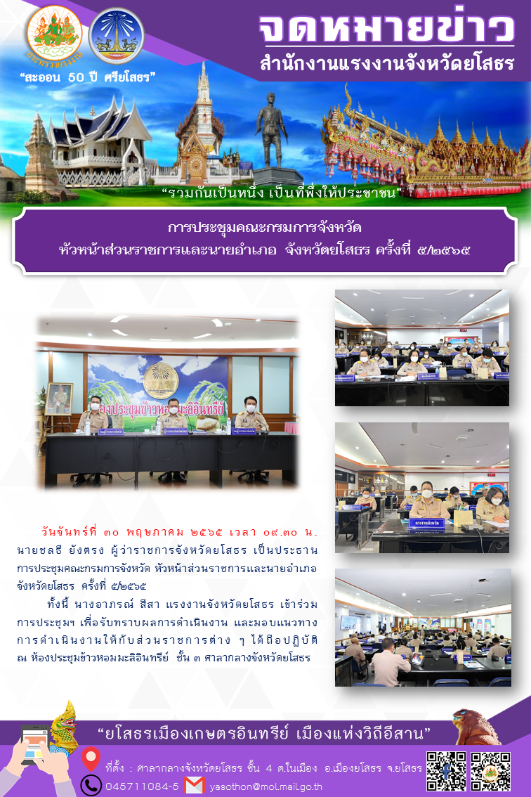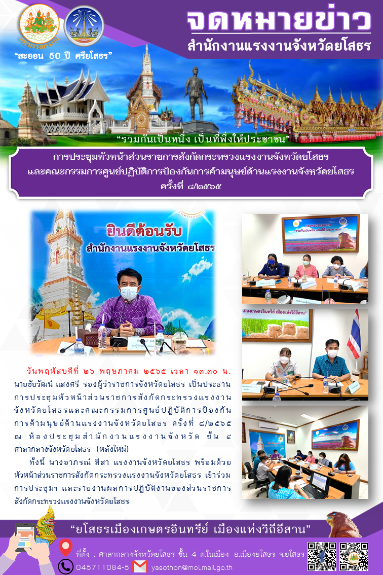การประชุมหัวหน้าส่วนราชการสังกัดกระทรวงแรงงานจังหวัดยโสธรและคณะกรรมการศูนย์ปฏิบัติการป้องกันการค้ามนุษย์ด้านแรงงานจังหวัดยโสธร ครั้งที่ 8/2565