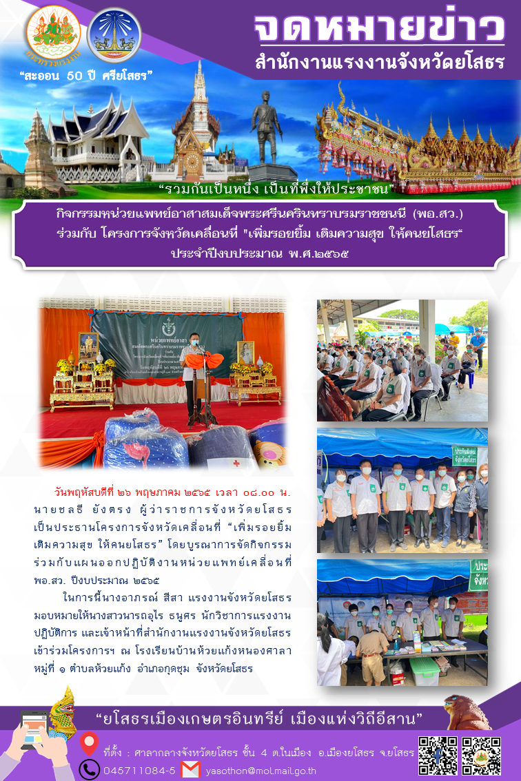 กิจกรรมหน่วยแพทย์อาสาสมเด็จพระศรีนครินทราบรมราชชนนี (พอ.สว.) ร่วมกับโครงการจังหวัดเคลื่อนที่ “เพิ่มรอยยิ้ม เติมความสุข ให้คนยโสธร“ ประจำปีงบประมาณ พ.ศ.2565